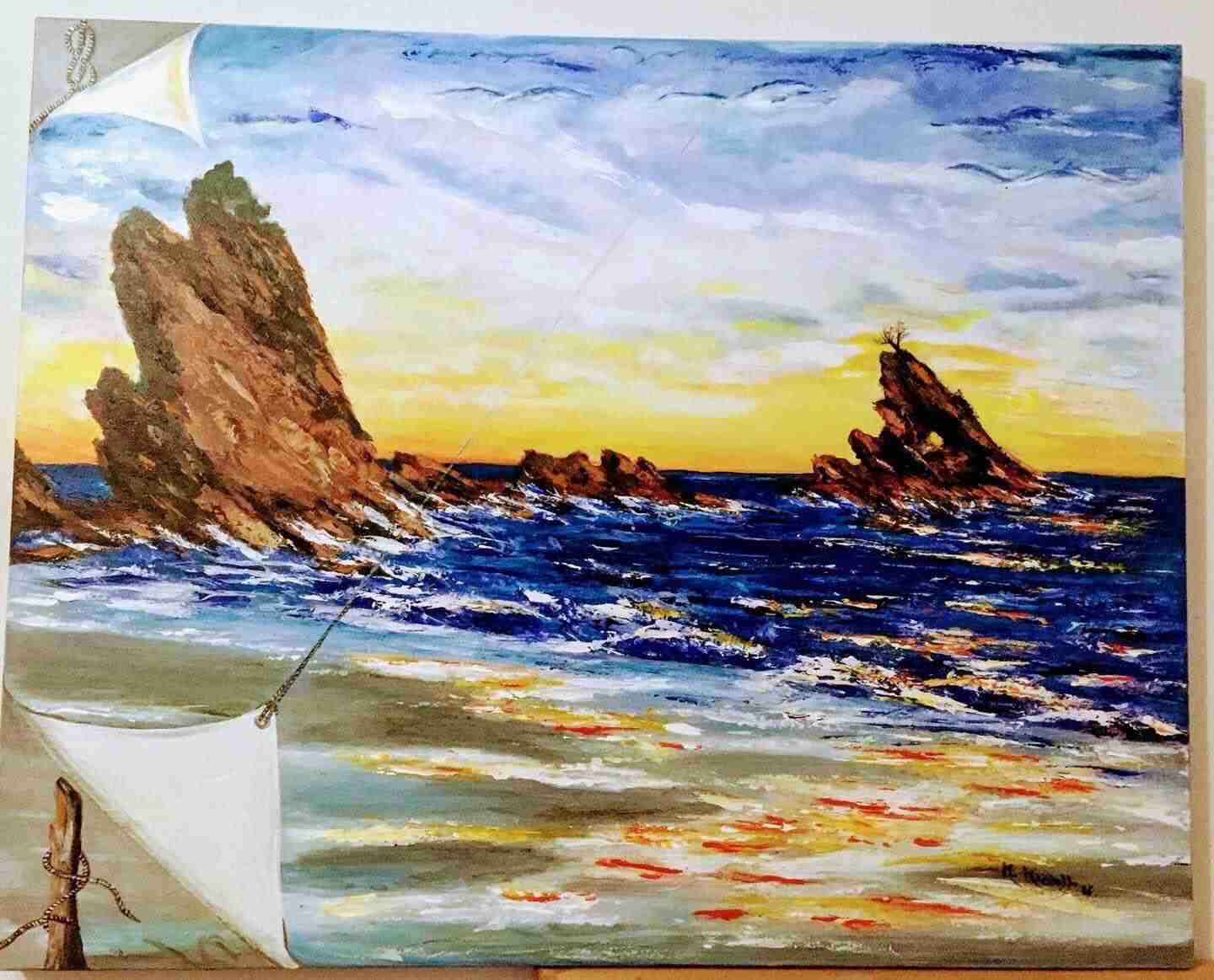 Il mare è per Mimma una grande fonte di ispirazione: quello della Tonnara, quello di un tramonto davanti allo Scoglio dell’Ulivo, con la Sicilia alle spalle e le Isole Eolie a fare da cornice. Dipinge pensando a quel posto in cui è nata e cresciuta, che le ha regalato enormi gioie, quel posto dove sono custoditi i ricordi più belli di un’infanzia trascorsa con i familiari e gli amici. Il rosso del tramonto, il blu del mare, il verde delle distese di campagna, sono i colori di Mimma, sono quei colori con cui la pittrice racconta la sua Palmi.
