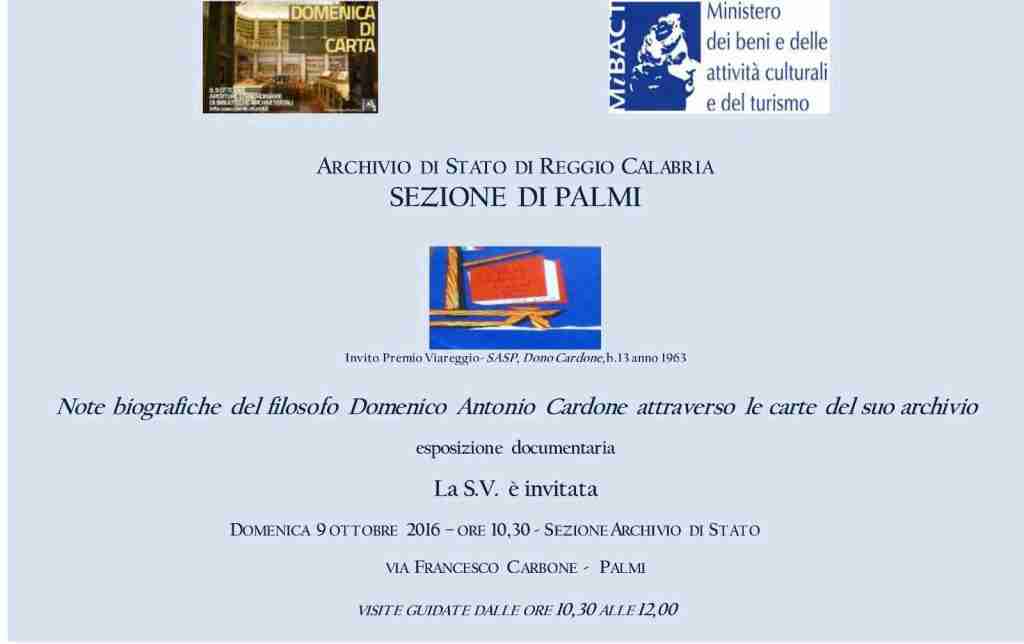 La Sezione di Archivio di Stato di Palmi apre le sue porte per offrire ai visitatori un percorso affascinante alla scoperta della storia del sapere attraverso i documenti del carteggio del filosofo Domenico Antonio Cardone avvocato in Palmi. Il suo archivio è stato donato dalla figlia Elsa all’Archivio nel 2011, per conservare e promuovere un messaggio di pace, che parte da un paese di provincia, per gli uomini di tutti i tempi e del mondo.