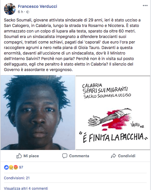 Duro anche un altro senatore Pd, Francesco Verducci: “Soumali era un sindacalista impegnato a difendere braccianti suoi compagni, trattati come schiavi, pagati dai ‘caporali’ due euro l’ora per raccogliere agrumi a nero nella piana di Gioia Tauro”, commenta su Facebook. “Davanti a questa enormità, davanti all’uccisione di un sindacalista, dov’è il Ministro dell’Interno Salvini? Perchè non parla? Perchè non è in visita sul posto dell’agguato, egli che peraltro è stato eletto in Calabria? Il silenzio del Governo è assordante e vergognoso”.