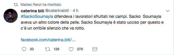 L’ex segretario Matteo Renzi ha invece retweettato un post della senatrice del Pd Caterina Biti: “#SackoSoumayla difendeva i lavoratori sfruttati nei campi. Sacko Soumayla aveva un altro colore della pelle. Sacko Soumayla è stato ucciso per questo e c’è un orribile silenzio che va rotto”.