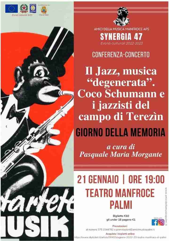 In occasione della prossima Giornata della Memoria sulle vittime dell’Olocausto, domani – 21 gennaio – il Cineteatro “Nicola Antonio Manfroce” di Palmi ospiterà alle ore 19:00 Conferenza-concerto “Il Jazz, musica degenerata, Coco Schumann e i jazzisti nel campo di Terezìn” curato da Pasquale Maria Morgante, musicista e docente presso il conservatorio Frescobaldi di Ferrara. L’evento è organizzato nell’ambito della rassegna Synergia 47 promossa da Amici della Musica Manfroce APS.