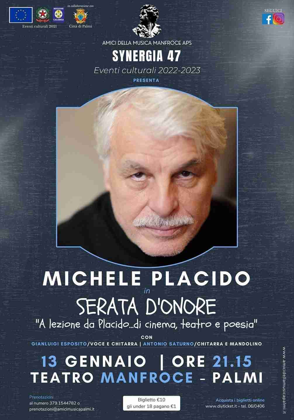 Andrà in scena questa sera – venerdì 13 gennaio – alle 21:15 al Teatro Manfroce di Palmi, nell’ambito della rassegna Synergia 24 promossa da Amici della Musica Manfroce APS, “Serata d’Onore. A lezione da Placido…di cinema, teatro e poesia” con il celebre attore e regista Michele Placido accompagnato da Gianluigi Esposito (voce e chitarra) e Antonio Saturno (chitarra e mandolino).