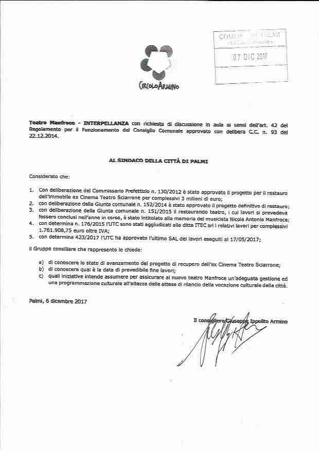 Pino Ippolito, infatti, nelle scorse settimane ha presentato al sindaco ed all’assessore alla cultura una interpellanza relativa al cinema teatro “Nicola Manfroce”, l’ex cinema Sciarrone, con la quale chiedeva di conoscere lo stato di avanzamento del progetto di recupero dell’immobile, di sapere quando si prevede l’apertura della struttura e se è intenzione dell’amministrazione avviare un’adeguata gestione della struttura, con una programmazione adeguata.