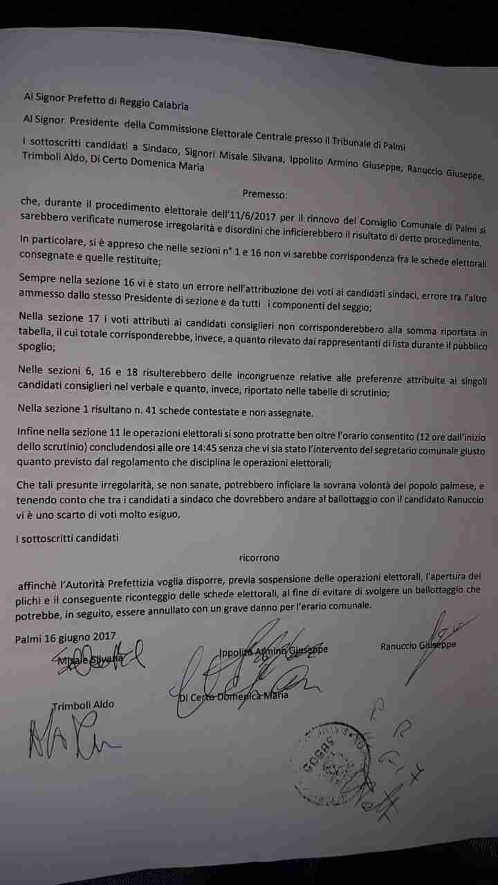 Una serie di irregolarità presunte che, “se non sanate, potrebbero inficiare la sovranità del popolo palmese e tenendo conto che tra i candidati a sindaco che dovrebbero andare al ballottaggio con il candidato Ranuccio vi è uno scarto molto esiguo, abbiamo deciso di ricorrere dinanzi al Prefetto”.