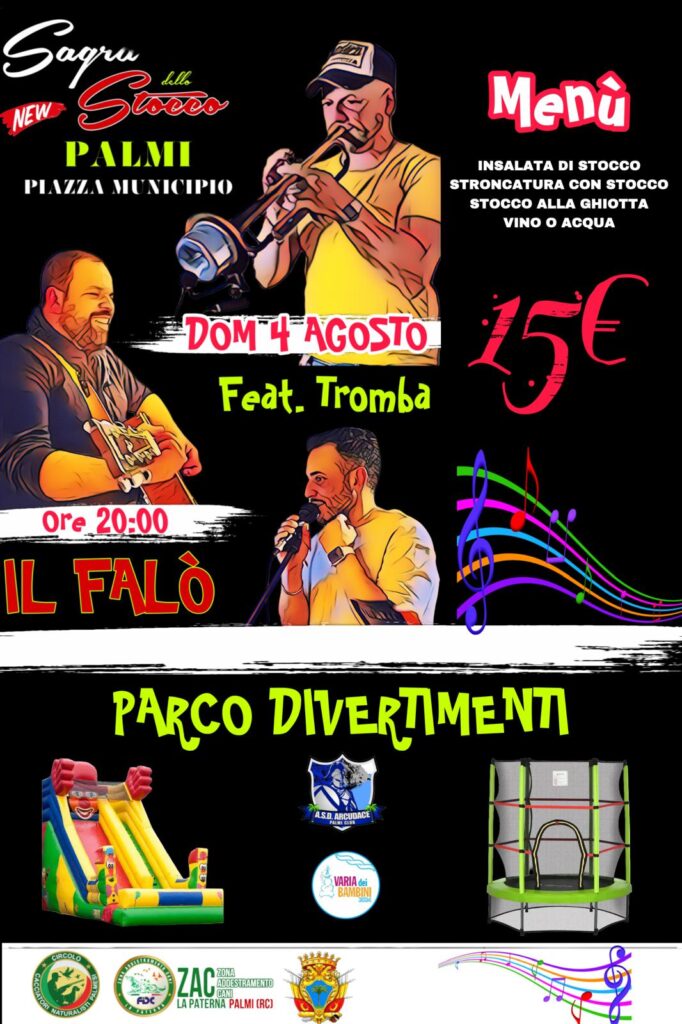 Domenica 4 agosto arriva a Palmi la prima edizione della Sagra dello Stocco organizzata dal Circolo Cacciatori Naturalisti Palmesi e della ZAC (Zona Addestramento Cani) “La Paterna”. A partire dalle 20:00 in Piazza Municipio, una serata da non perdere tra gastronomia, musica e giochi per i più piccoli, per celebrare in grande festa uno dei piatti più rappresentativi della cucina calabrese.