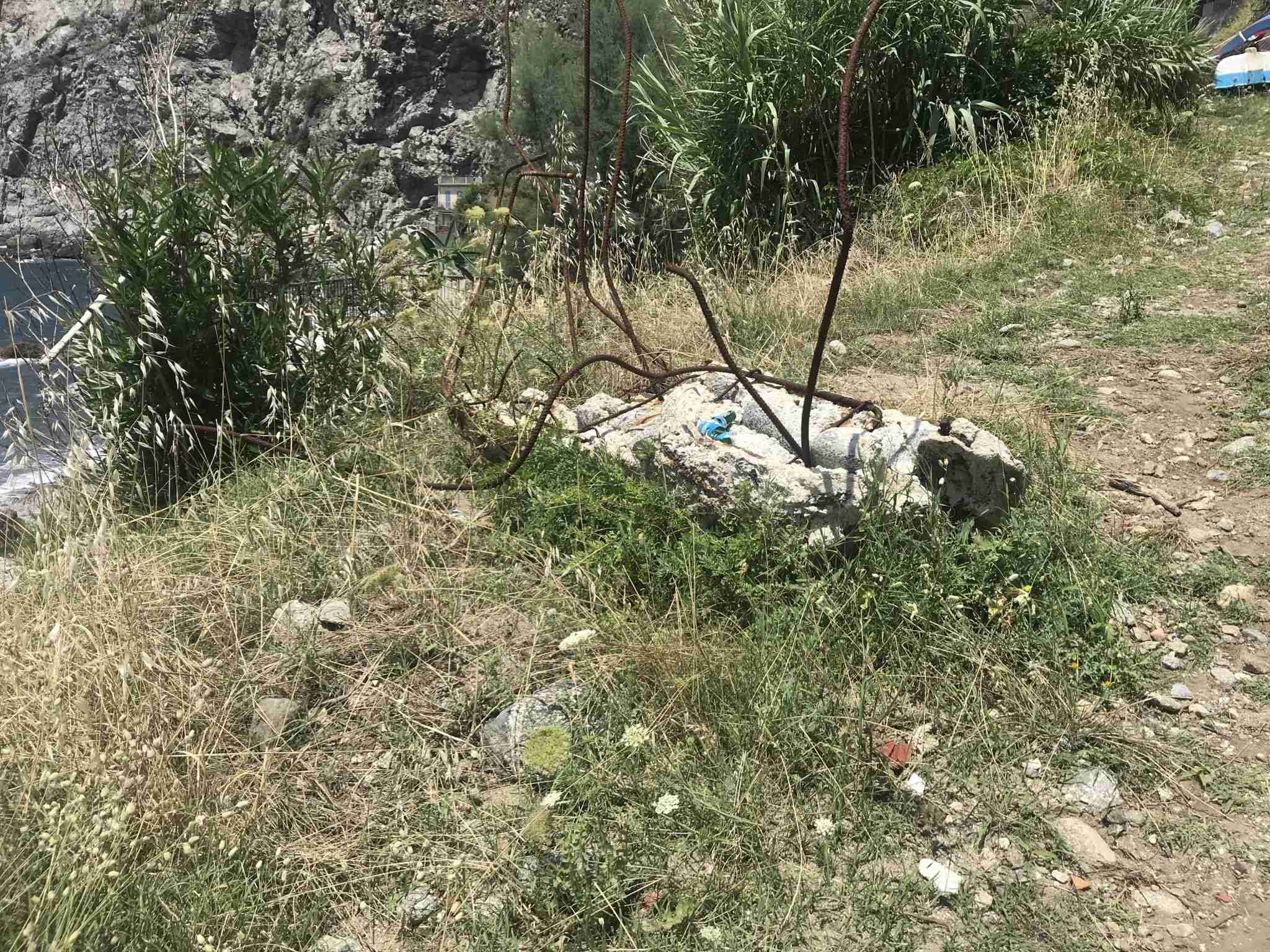 Decine di rifiuti per ogni passo fatto sulla spiaggia e lungo il sentiero che conduce in riva al mare. Rifiuti di ogni tipo, forma, colore. Bottiglie in plastica, flaconi di detersivi, lattine di tonno, buste. Materiale di risulta ed un blocco in cemento armato con dei ferri arrugginiti che giace a terra e che rappresenta un pericolo. Una scala in legno ormai cadente. E poi erba alta ovunque che impedisce o rende difficoltoso il passaggio a chi cerca di raggiungere la spiaggia.