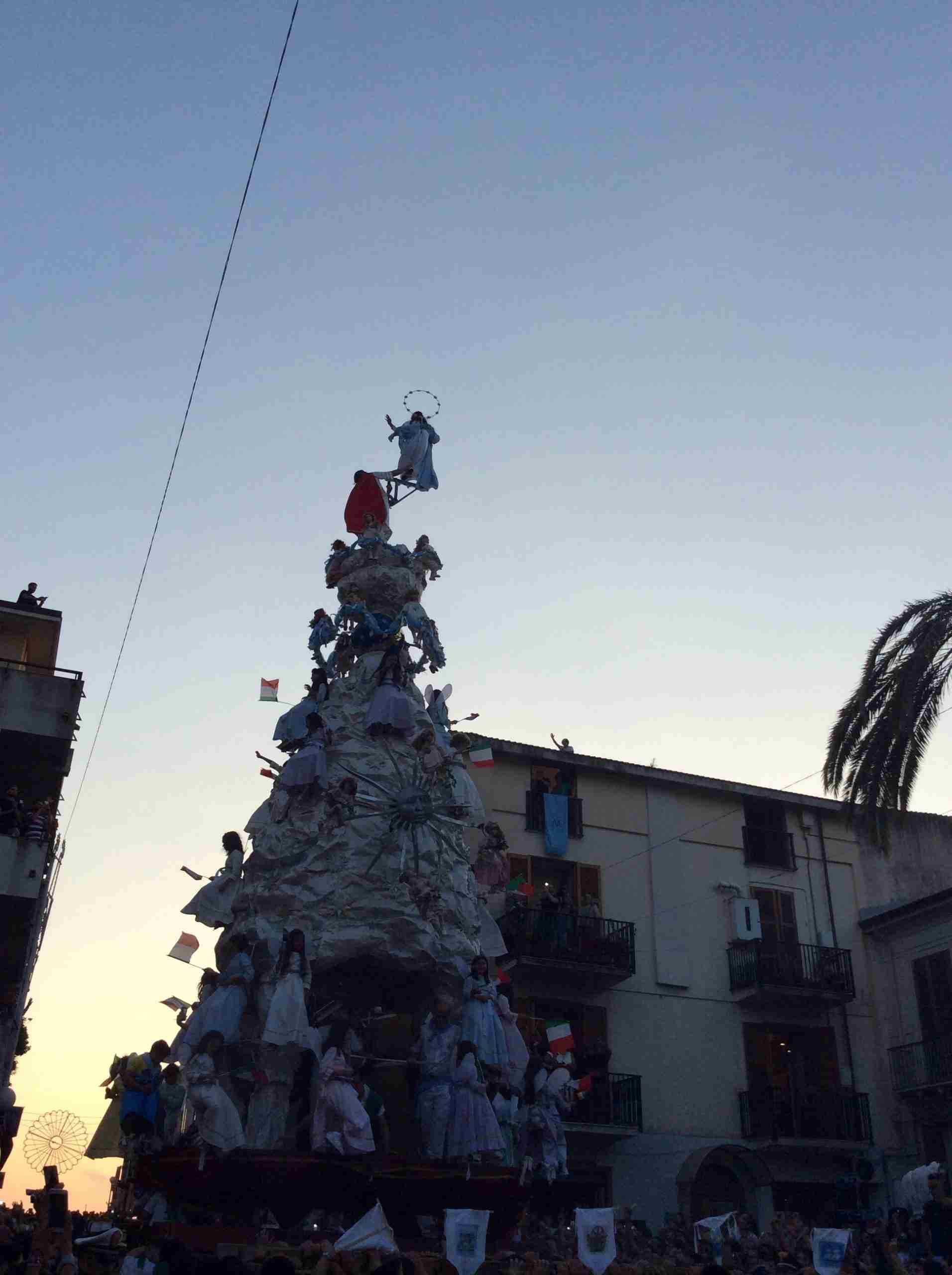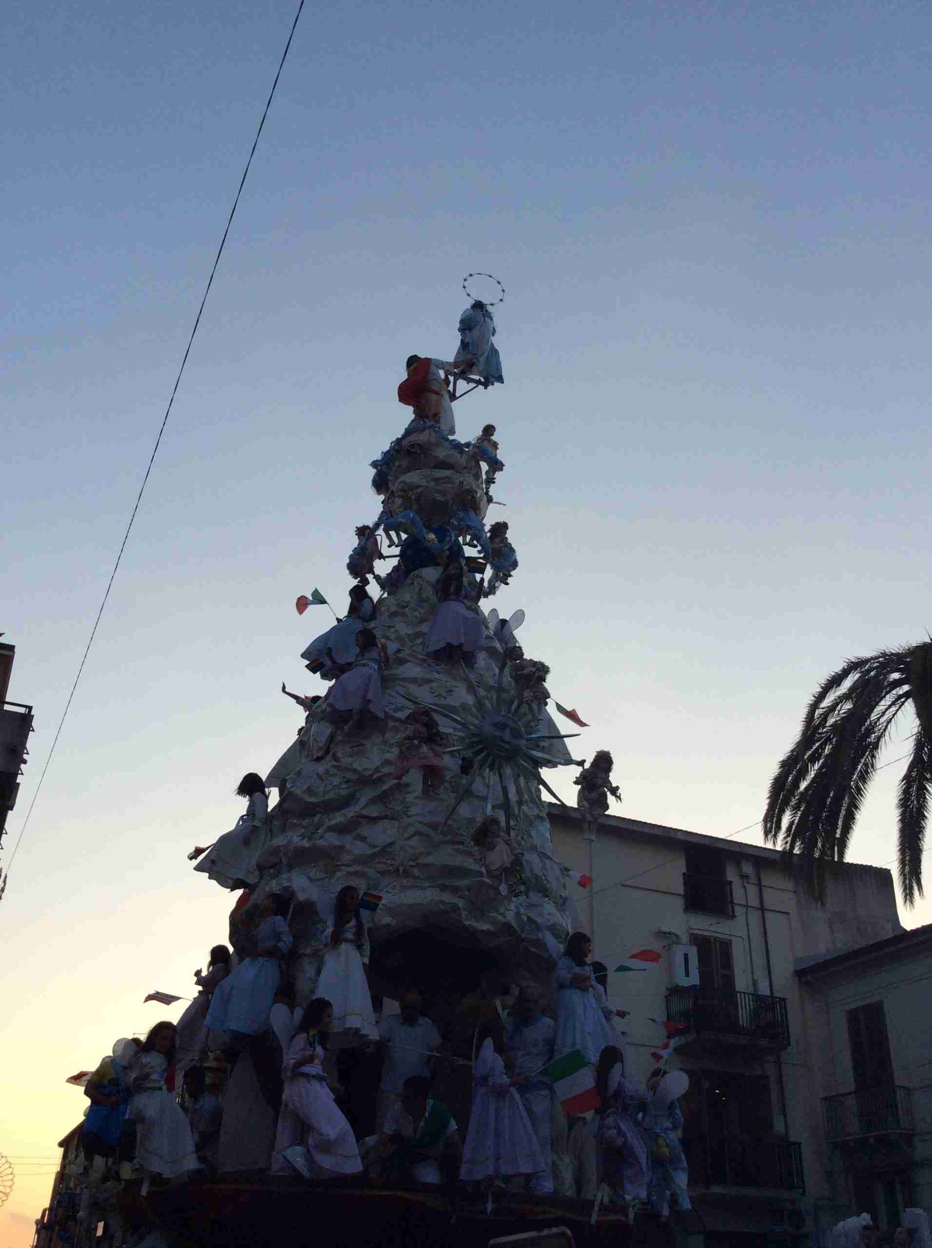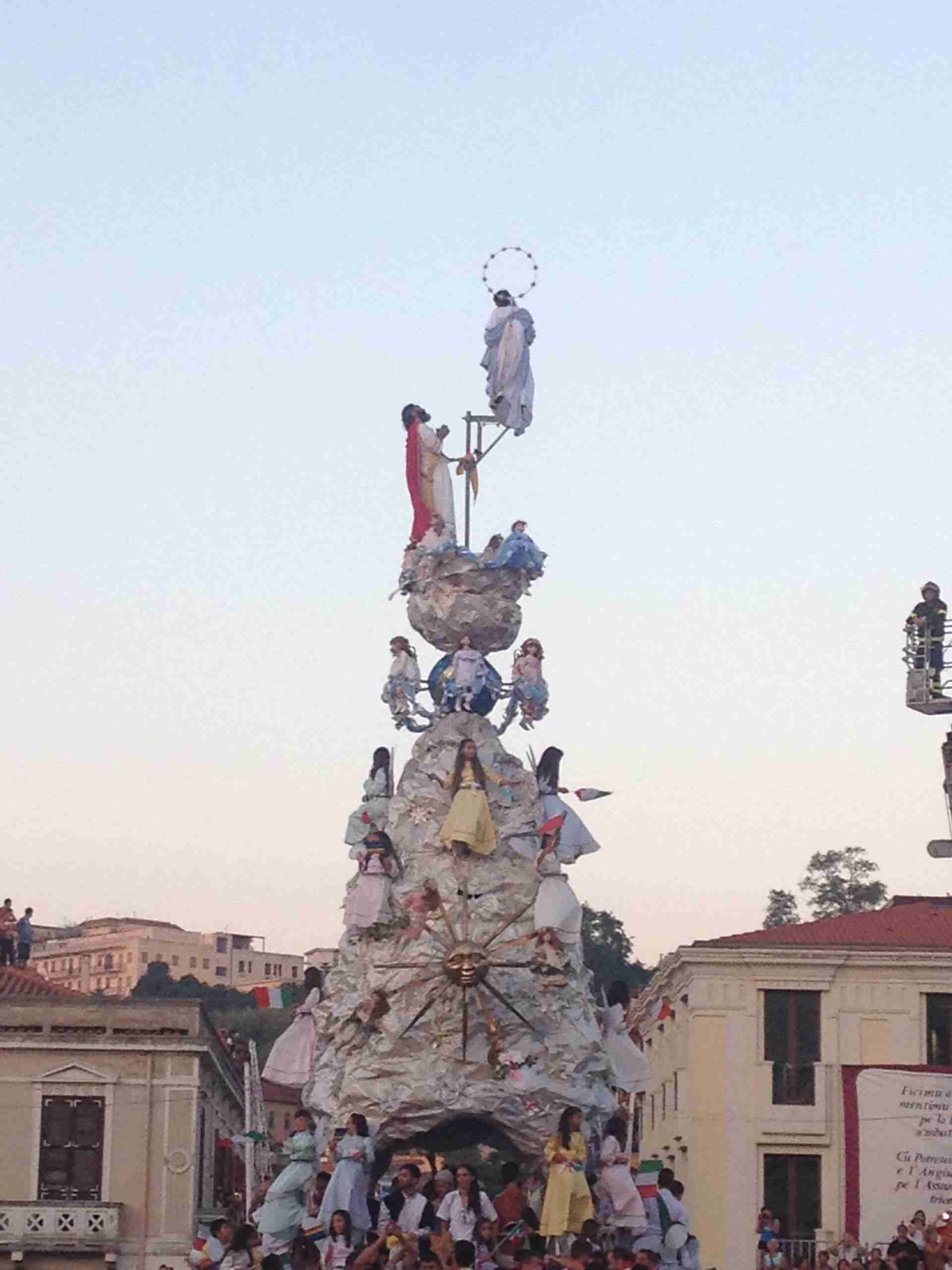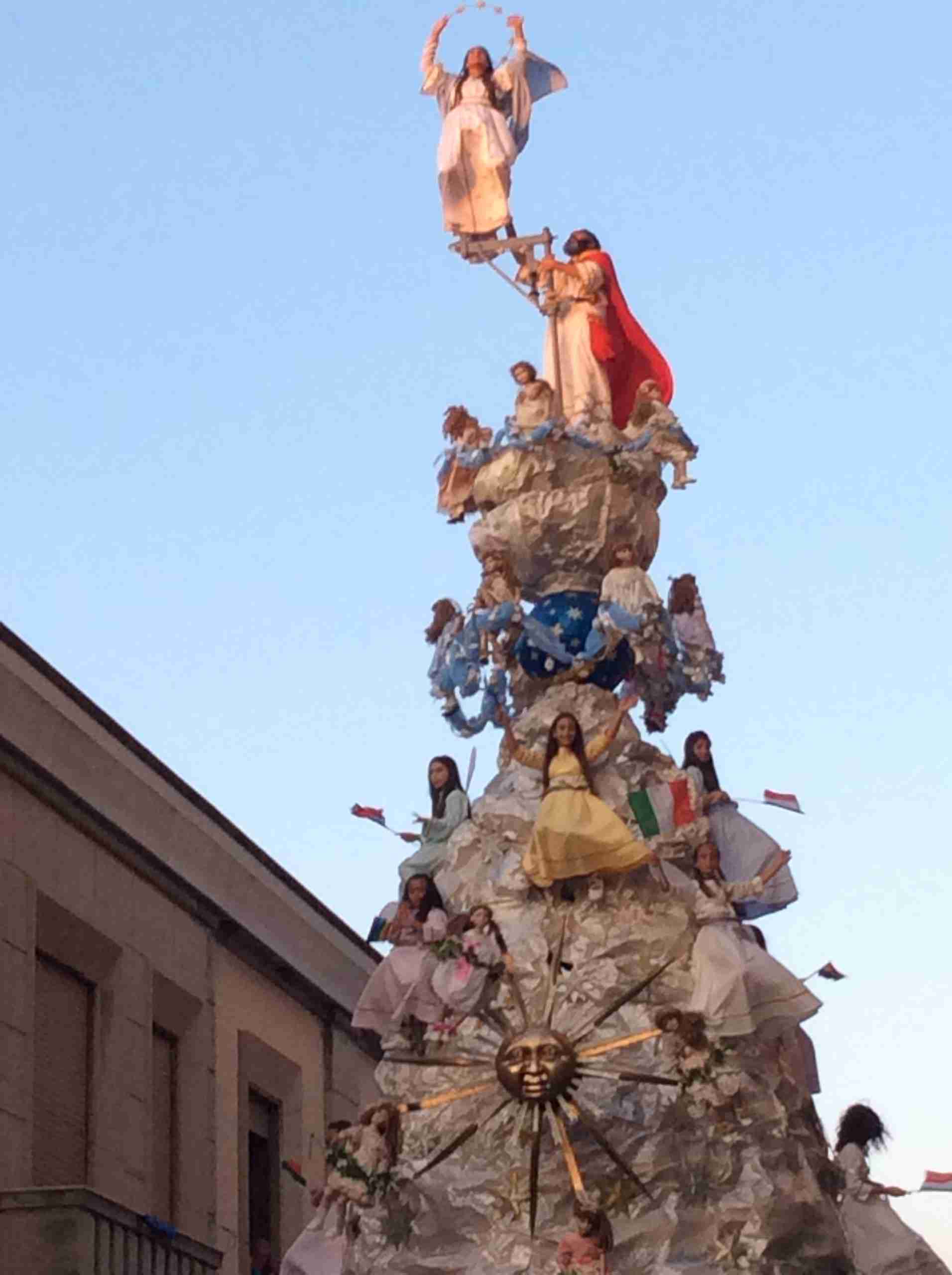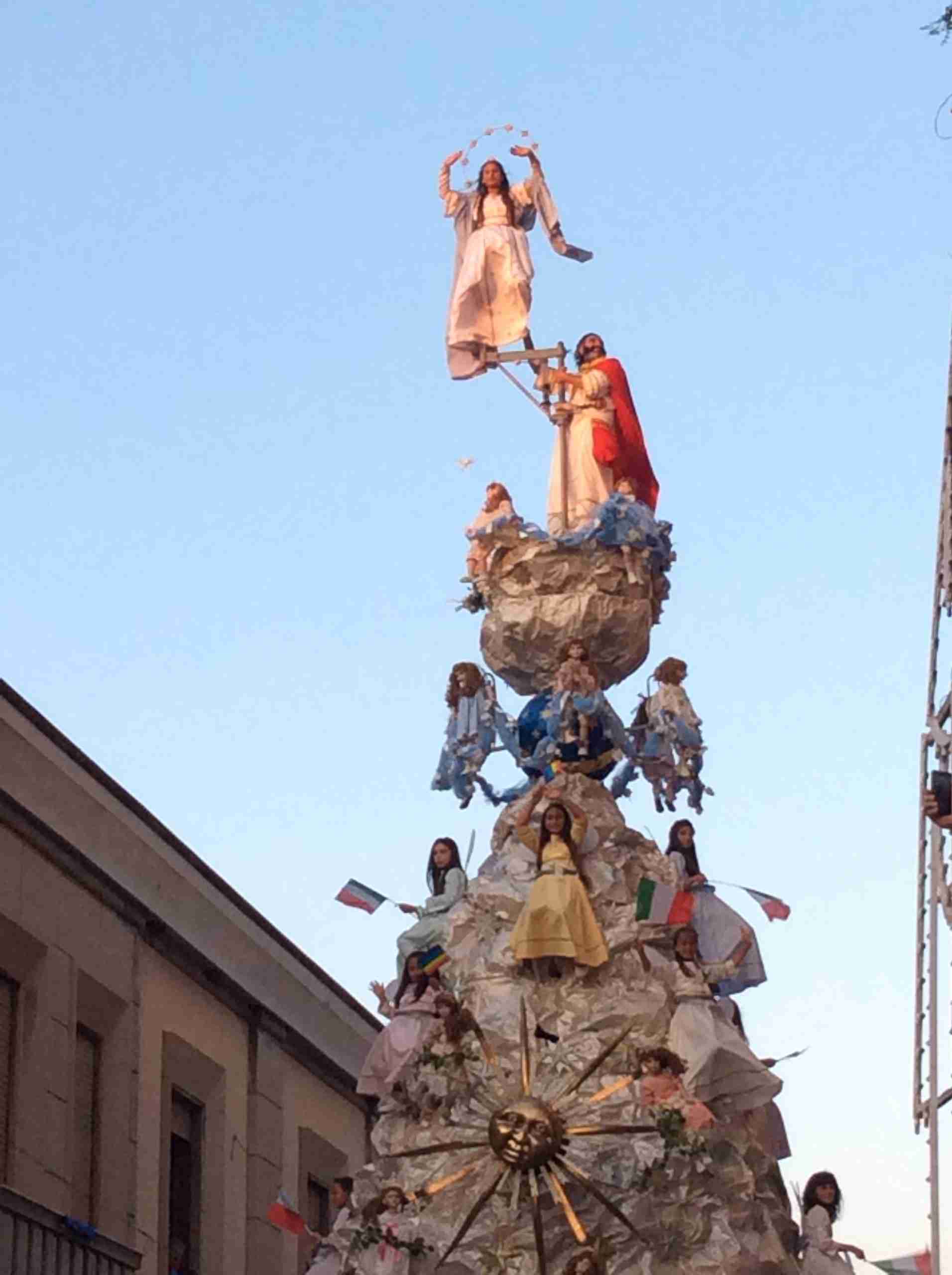 Sulla sua estremità, a poco meno di 16 metri di altezza, una fanciulla che rappresenta la Vergine Maria mentre sale al cielo, saluta e benedice la folla. Gli angeli l’accompagnano ed acclamano, il Padreterno al suo fianco le dà coraggio. Ai loro piedi gli ‘mbuttaturi, 200 giovani divisi in cinque corporazioni che spingono il carro con la forza delle braccia e delle gambe. E alle corde il popolo, i palmesi ed i non palmesi, che tirano anche loro, con forza, e che conducono la Vergine al cielo.
