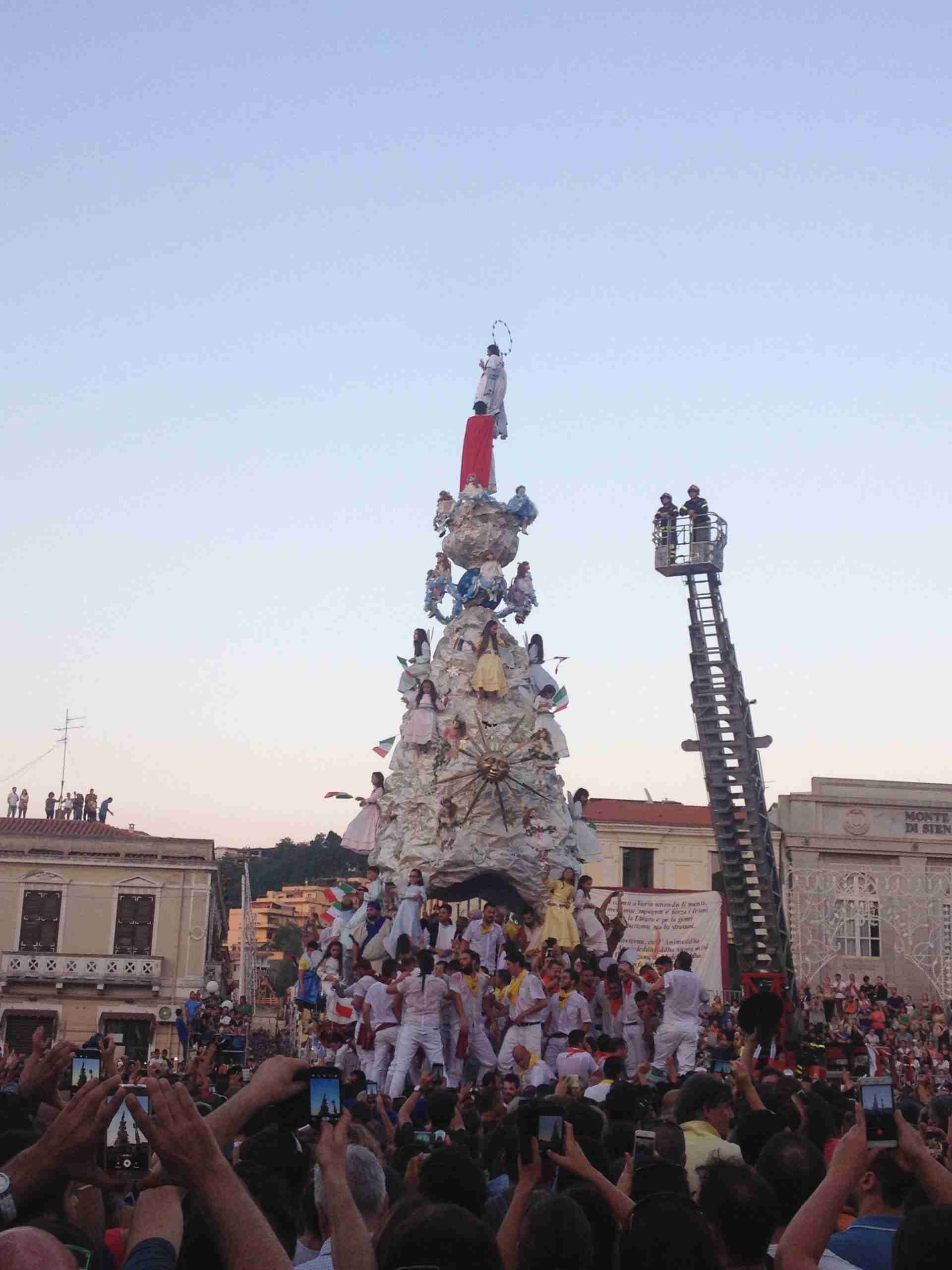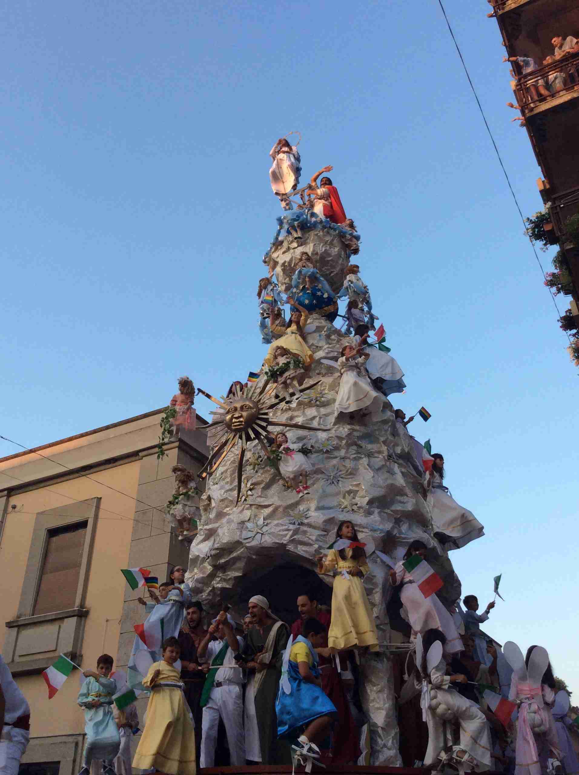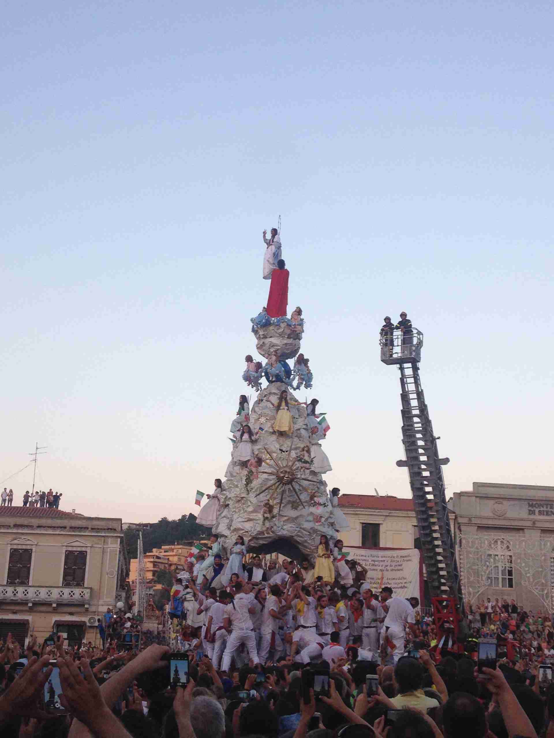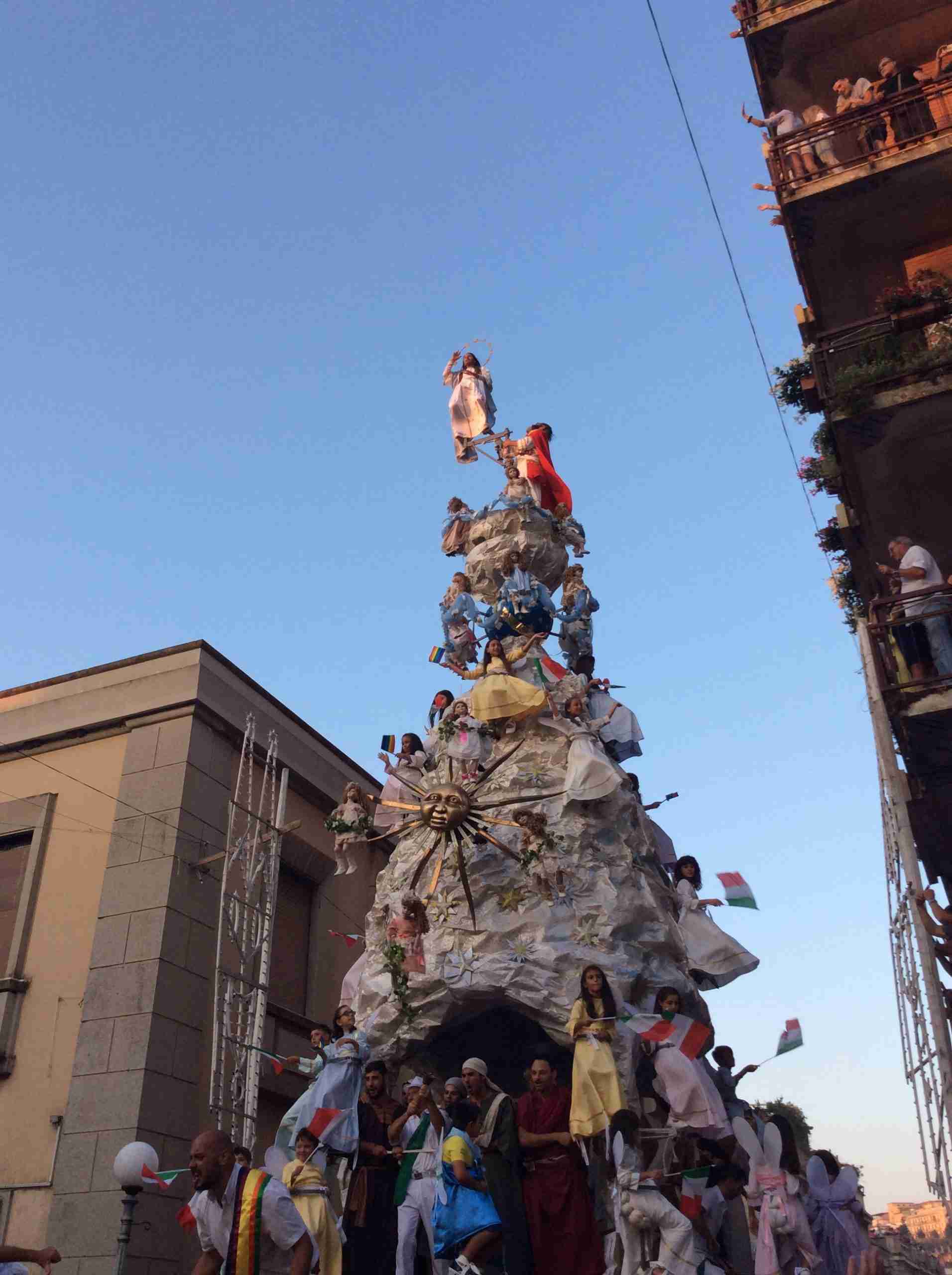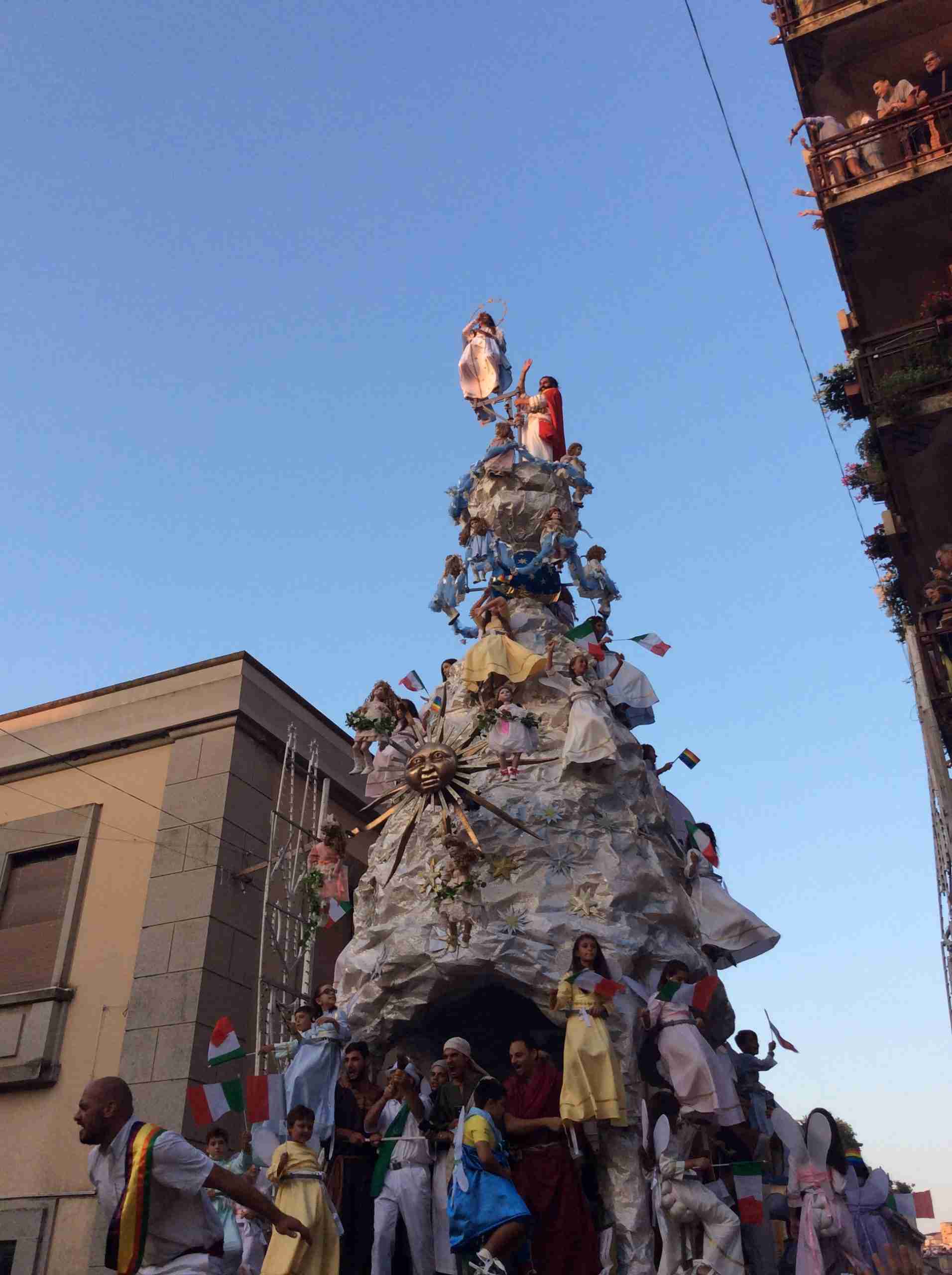 Sulla sua estremità, a poco meno di 16 metri di altezza, una fanciulla che rappresenta la Vergine Maria mentre sale al cielo, saluta e benedice la folla. Gli angeli l’accompagnano ed acclamano, il Padreterno al suo fianco le dà coraggio. Ai loro piedi gli ‘mbuttaturi, 200 giovani divisi in cinque corporazioni che spingono il carro con la forza delle braccia e delle gambe. E alle corde il popolo, i palmesi ed i non palmesi, che tirano anche loro, con forza, e che conducono la Vergine al cielo.