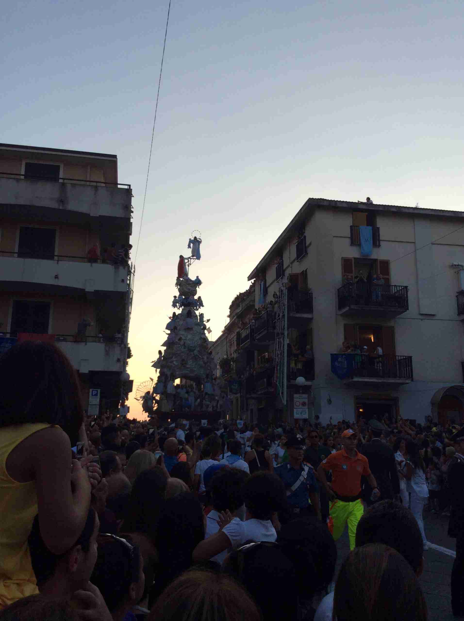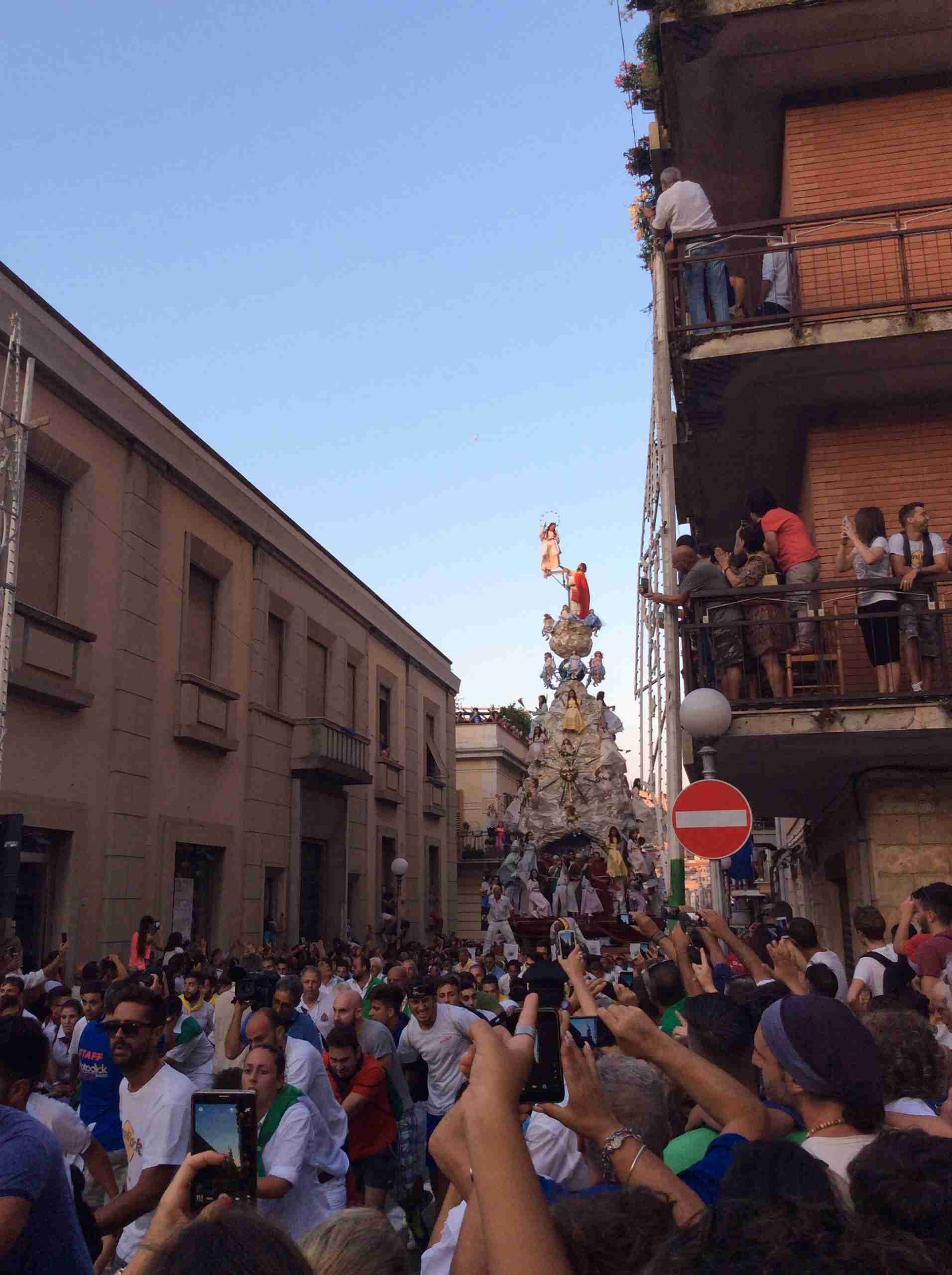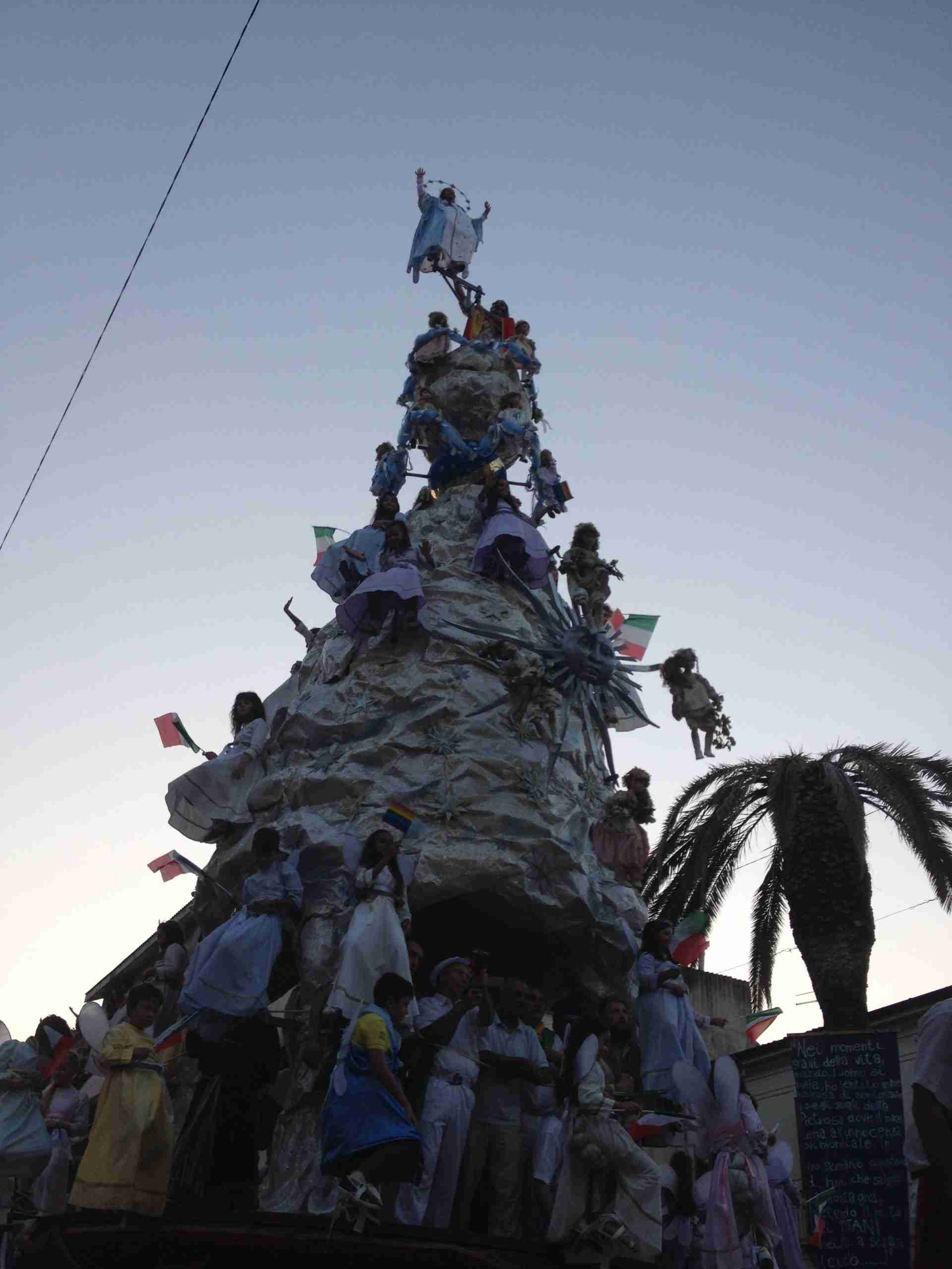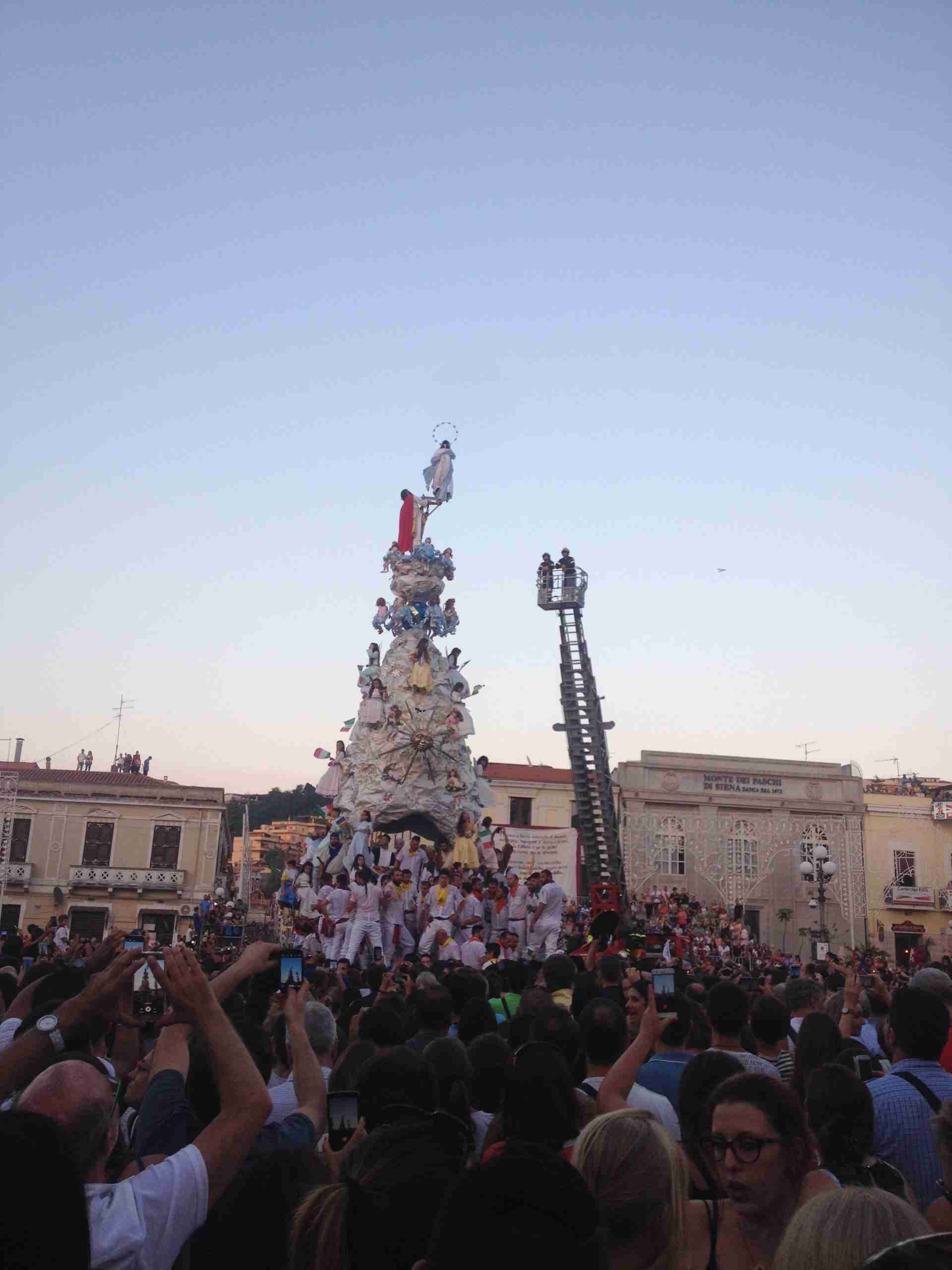 Sulla sua estremità, a poco meno di 16 metri di altezza, una fanciulla che rappresenta la Vergine Maria mentre sale al cielo, saluta e benedice la folla. Gli angeli l’accompagnano ed acclamano, il Padreterno al suo fianco le dà coraggio. Ai loro piedi gli ‘mbuttaturi, 200 giovani divisi in cinque corporazioni che spingono il carro con la forza delle braccia e delle gambe. E alle corde il popolo, i palmesi ed i non palmesi, che tirano anche loro, con forza, e che conducono la Vergine al cielo.