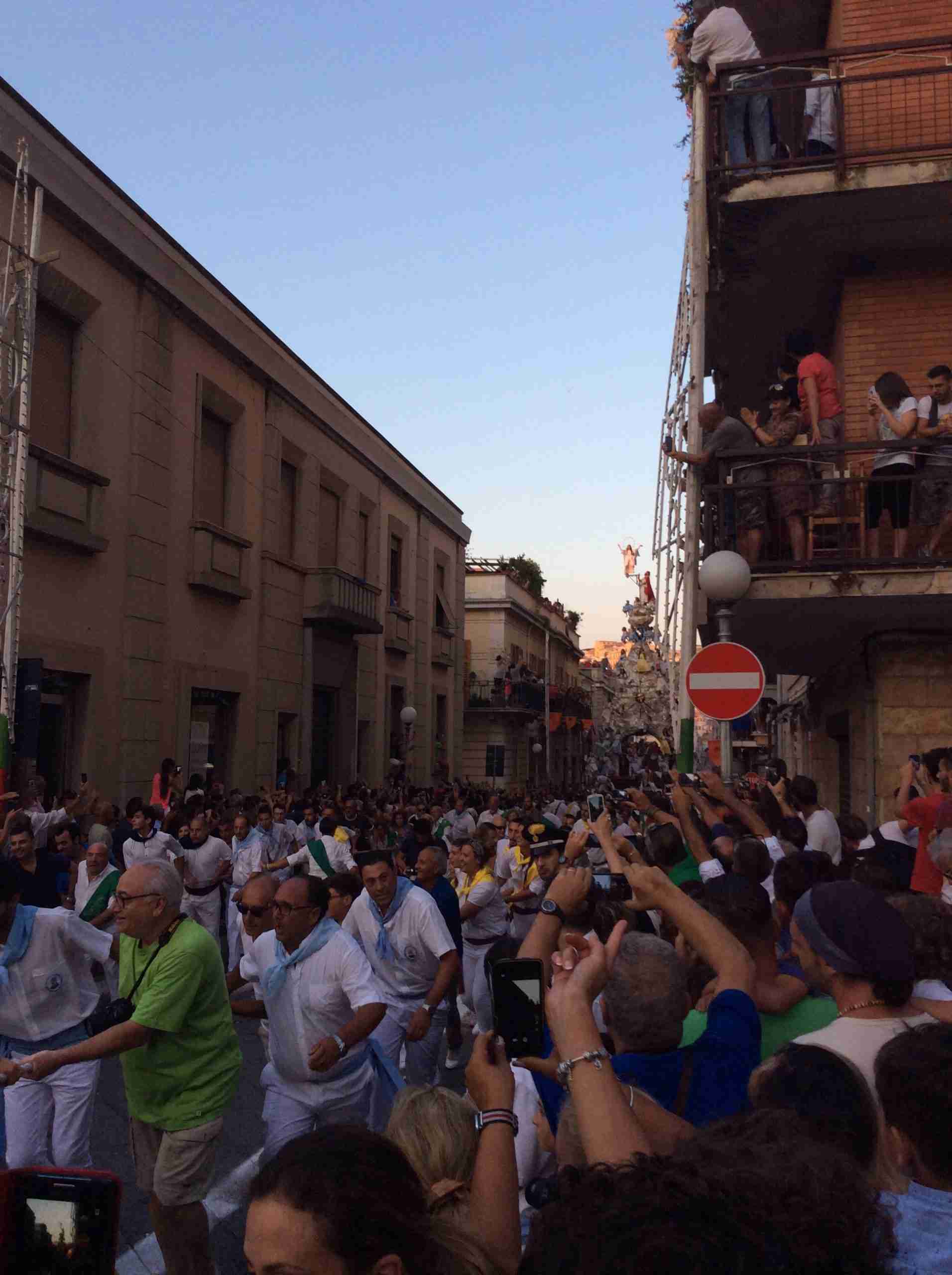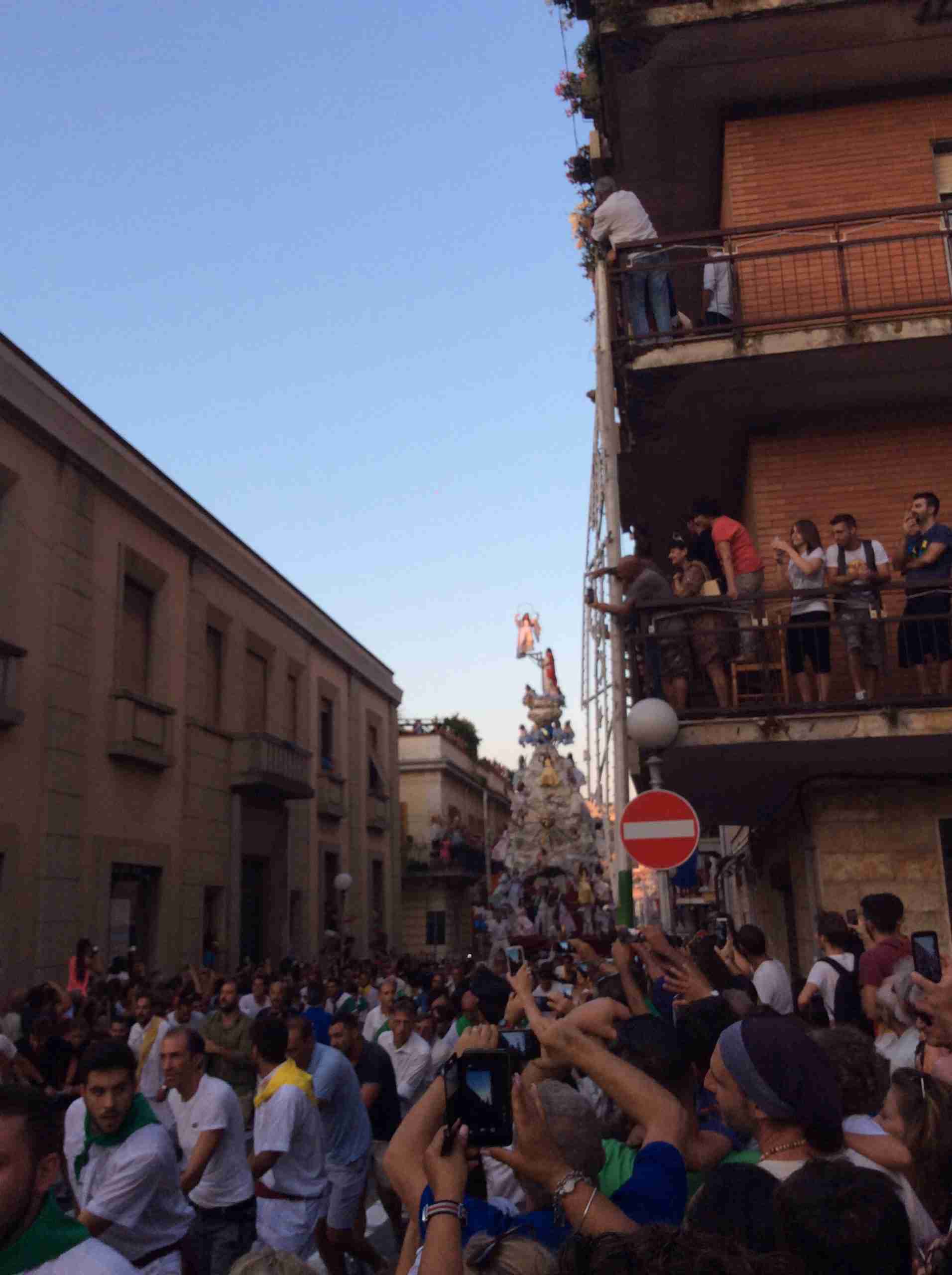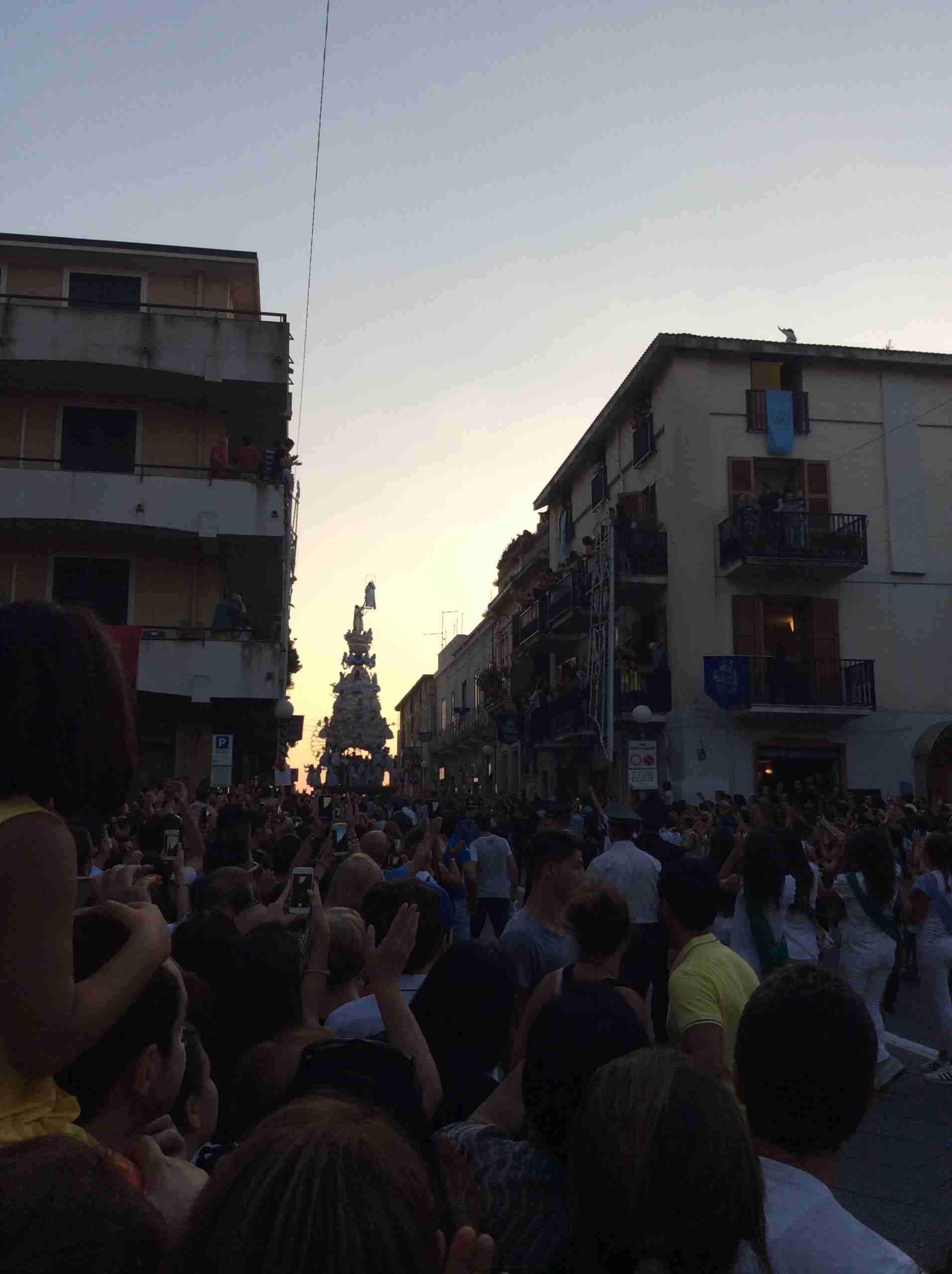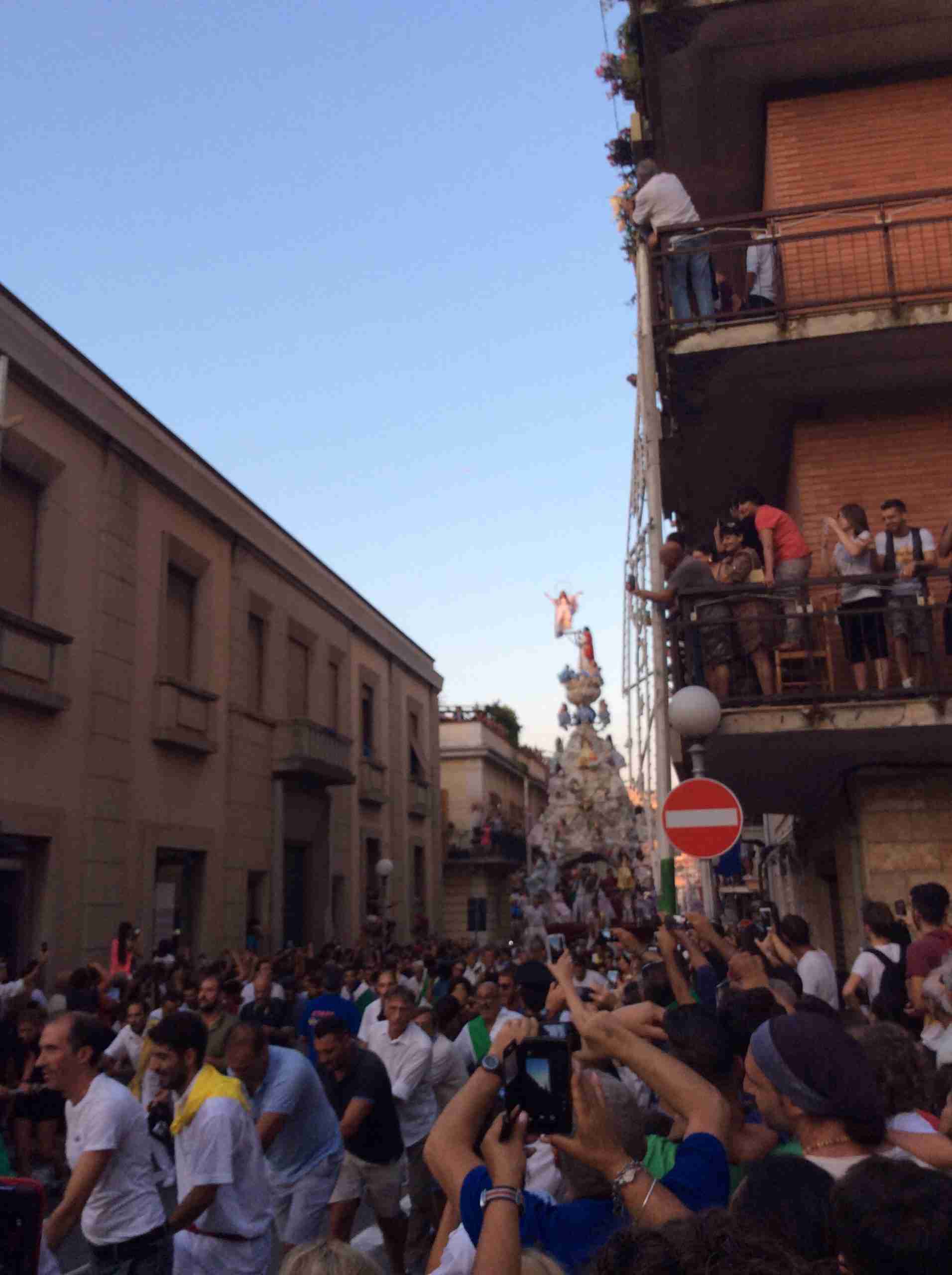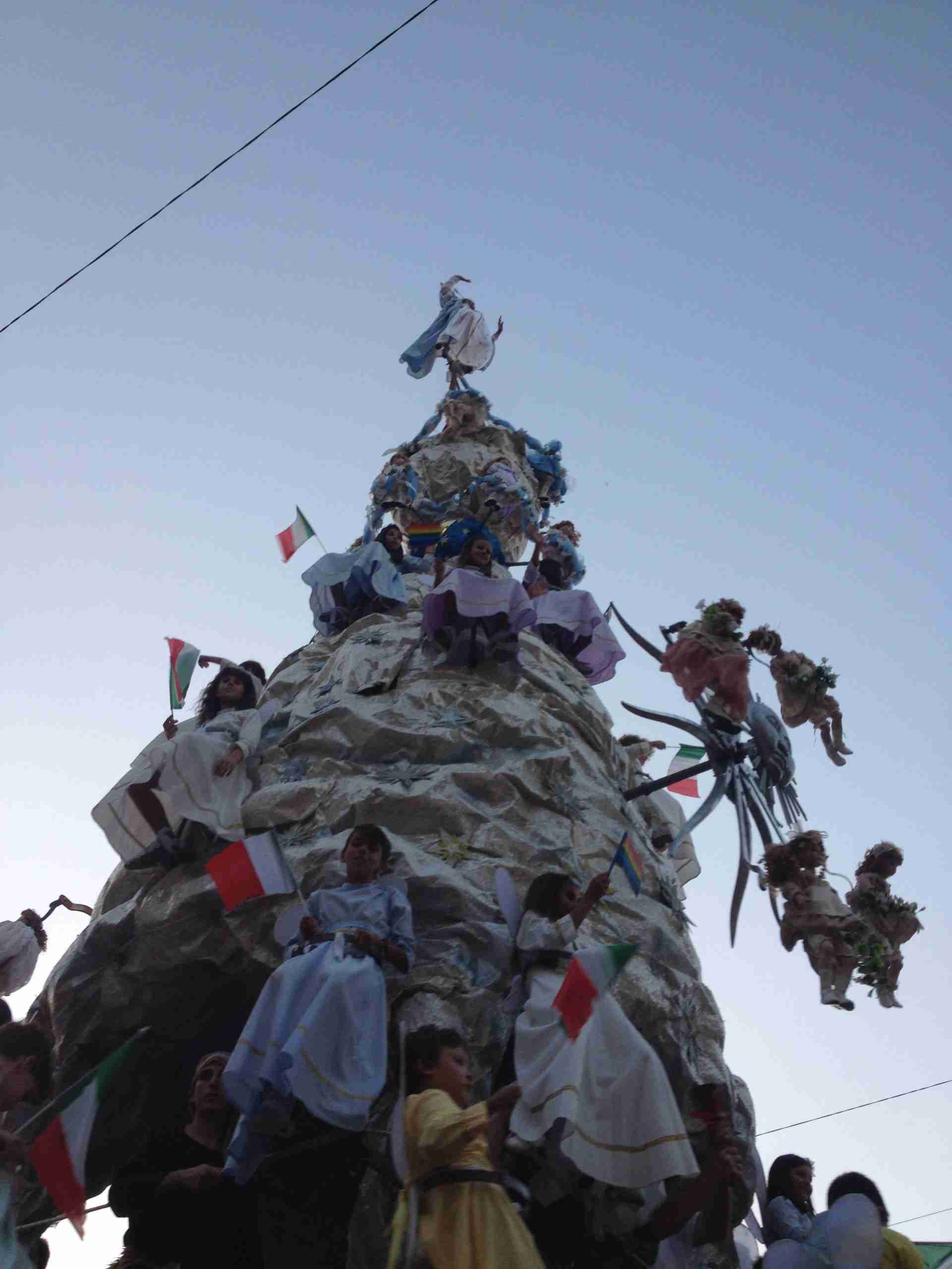 Sulla sua estremità, a poco meno di 16 metri di altezza, una fanciulla che rappresenta la Vergine Maria mentre sale al cielo, saluta e benedice la folla. Gli angeli l’accompagnano ed acclamano, il Padreterno al suo fianco le dà coraggio. Ai loro piedi gli ‘mbuttaturi, 200 giovani divisi in cinque corporazioni che spingono il carro con la forza delle braccia e delle gambe. E alle corde il popolo, i palmesi ed i non palmesi, che tirano anche loro, con forza, e che conducono la Vergine al cielo.