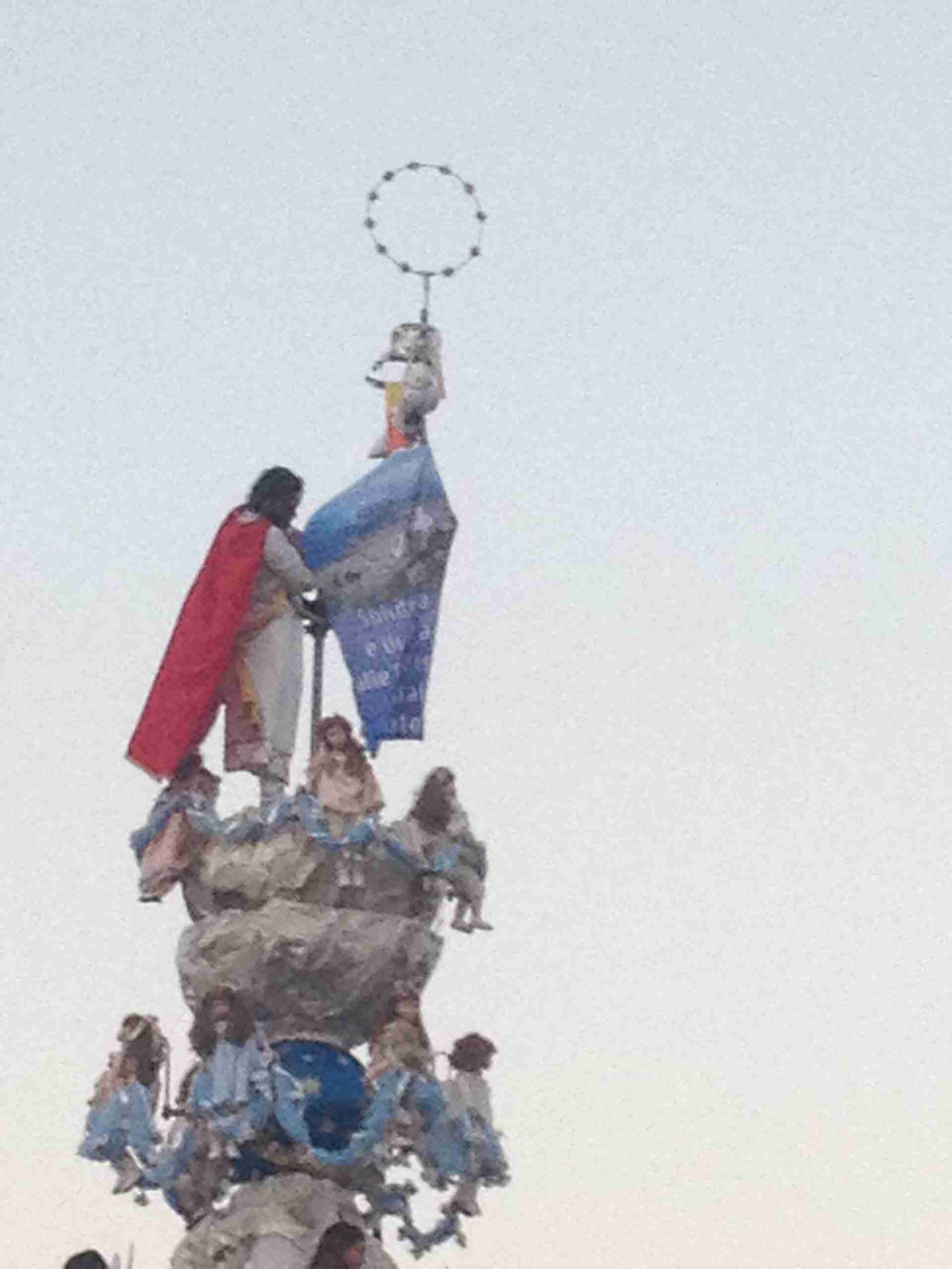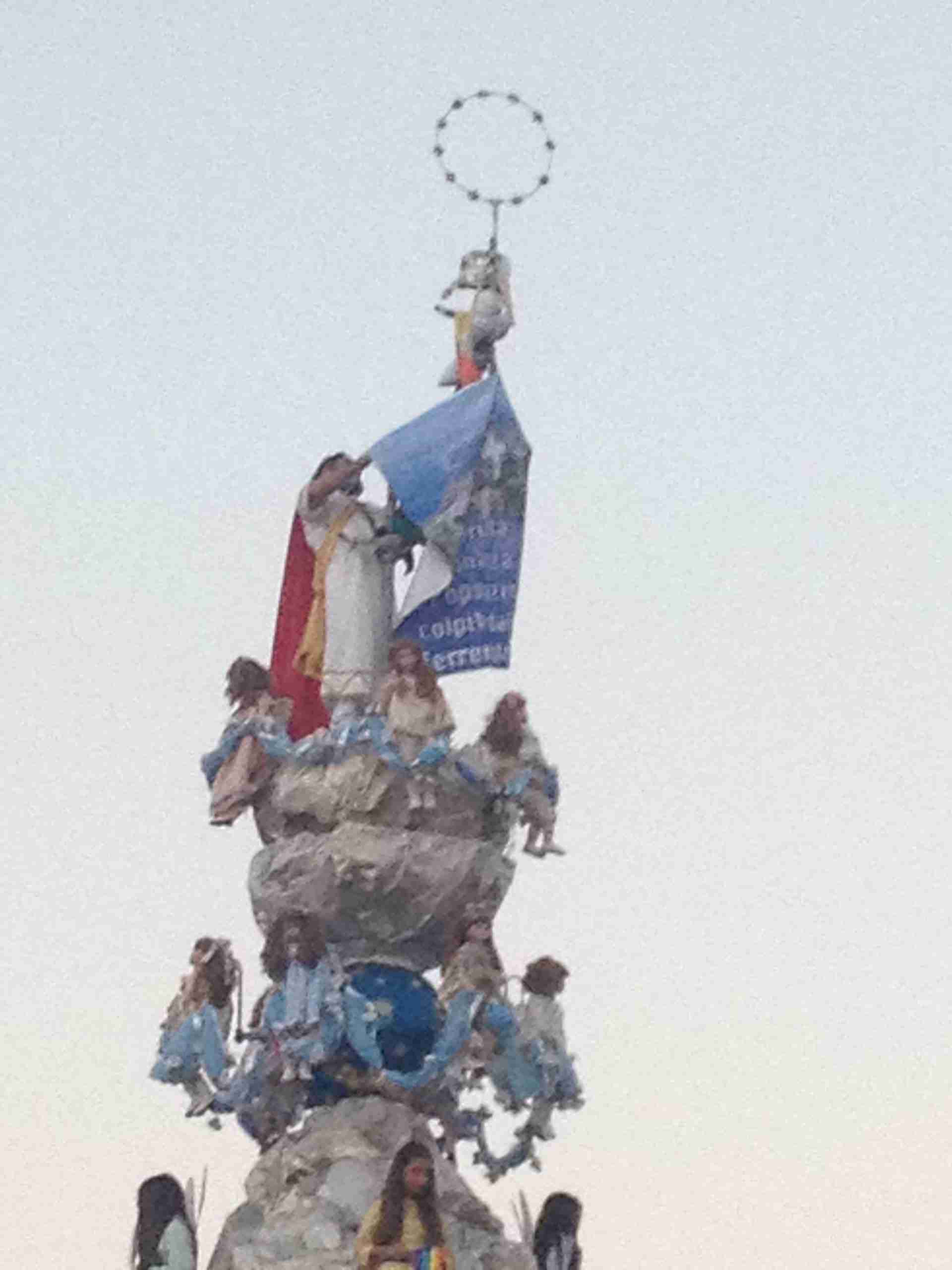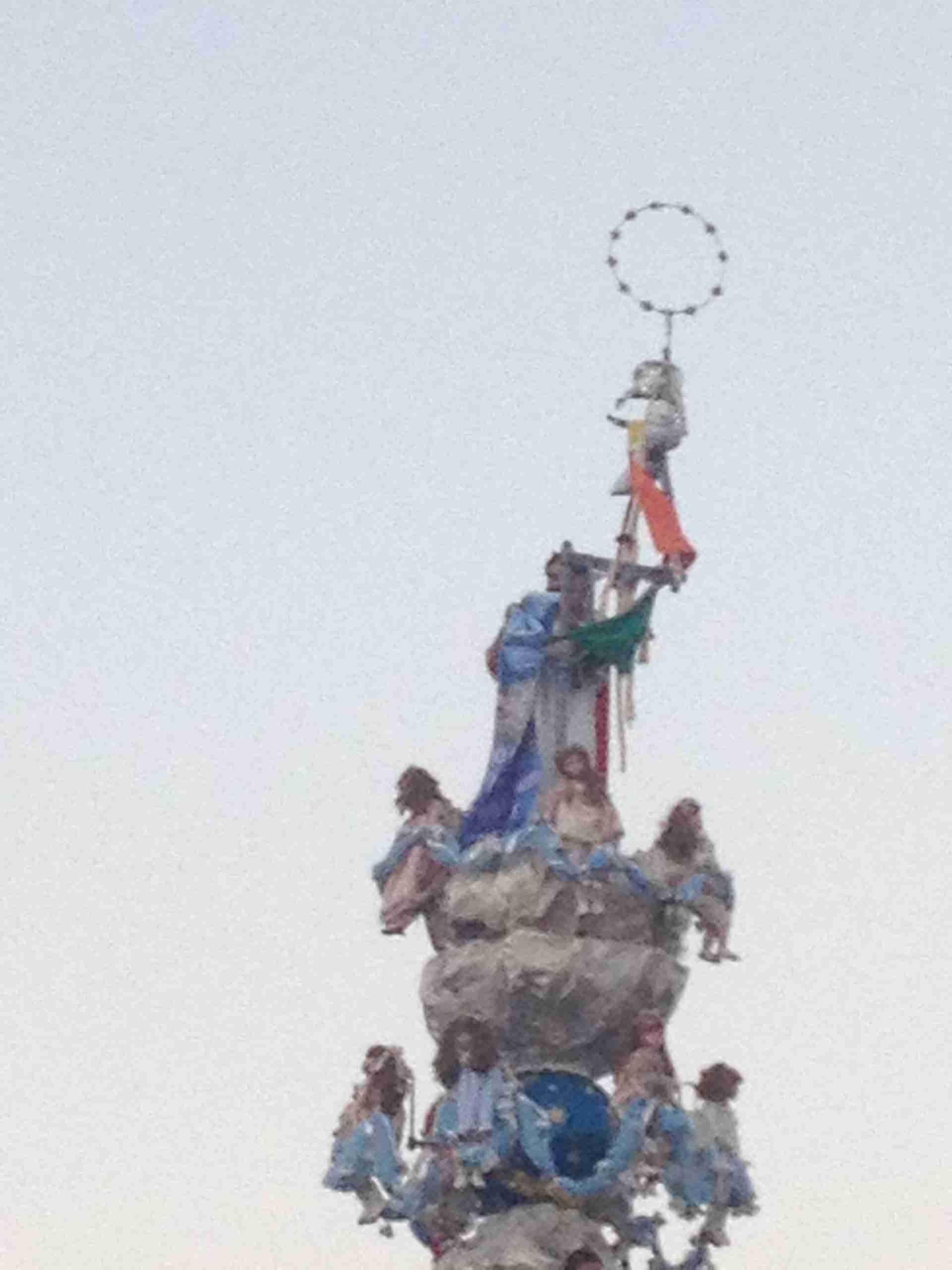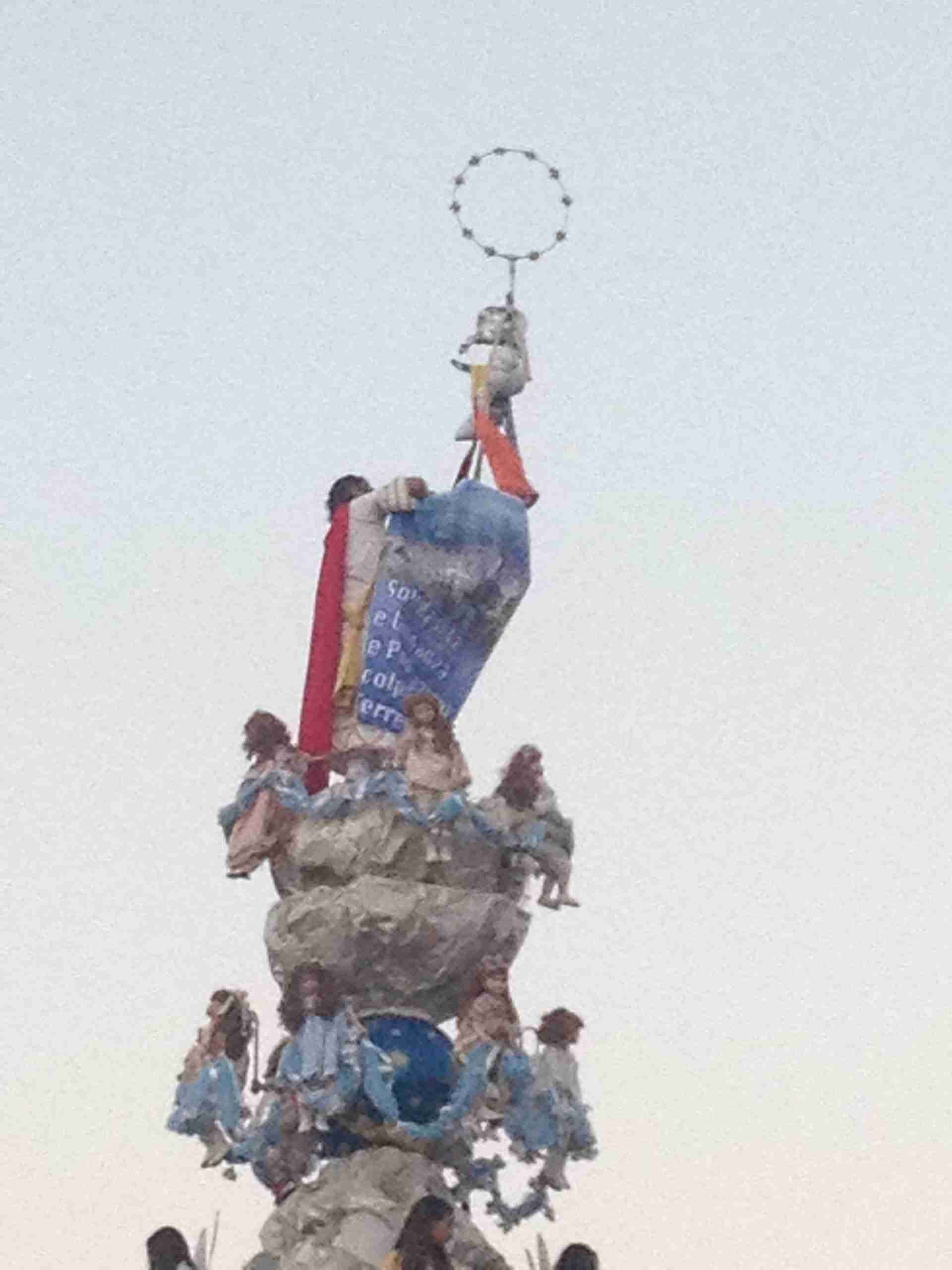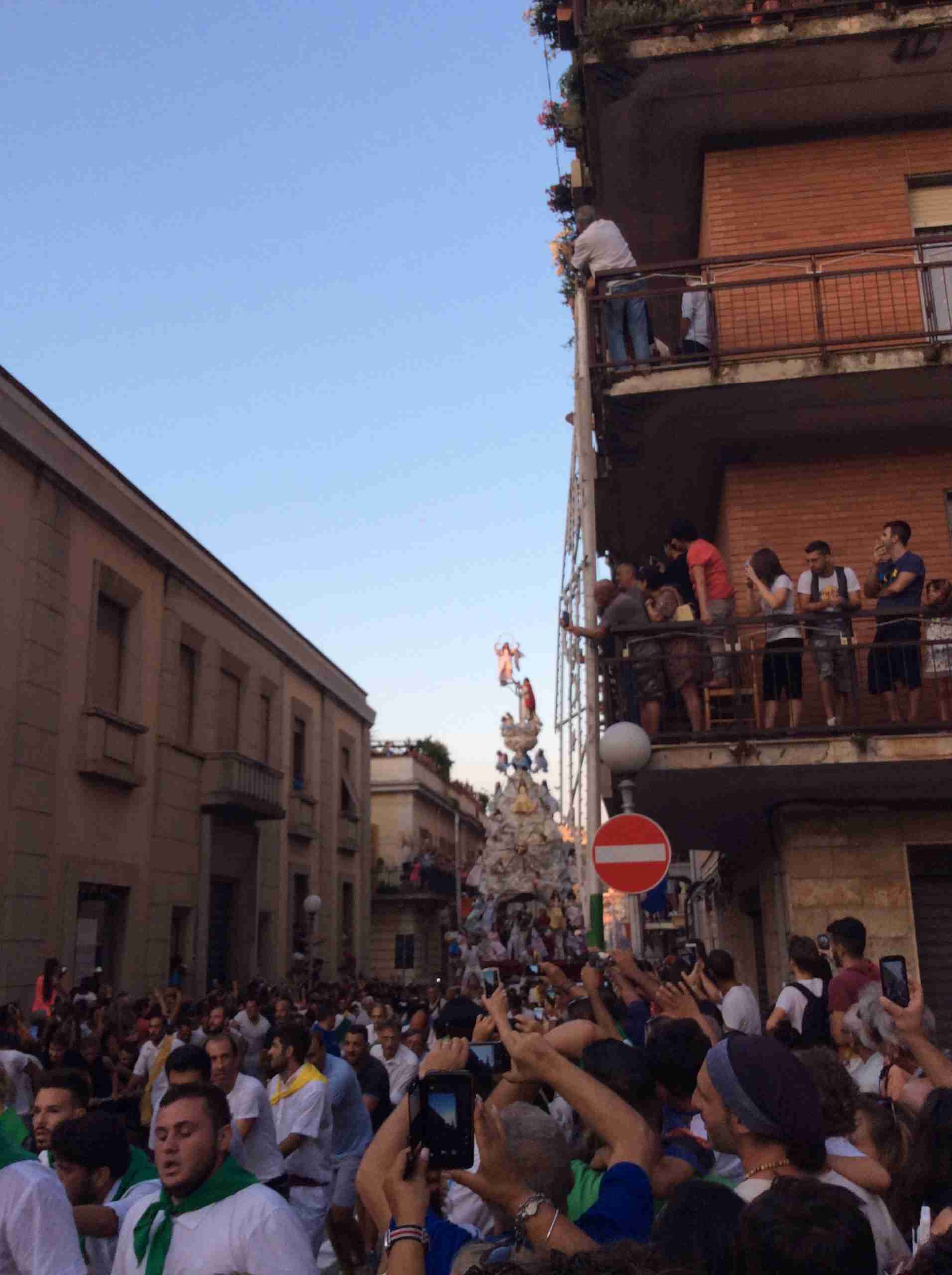 Sulla sua estremità, a poco meno di 16 metri di altezza, una fanciulla che rappresenta la Vergine Maria mentre sale al cielo, saluta e benedice la folla. Gli angeli l’accompagnano ed acclamano, il Padreterno al suo fianco le dà coraggio. Ai loro piedi gli ‘mbuttaturi, 200 giovani divisi in cinque corporazioni che spingono il carro con la forza delle braccia e delle gambe. E alle corde il popolo, i palmesi ed i non palmesi, che tirano anche loro, con forza, e che conducono la Vergine al cielo.