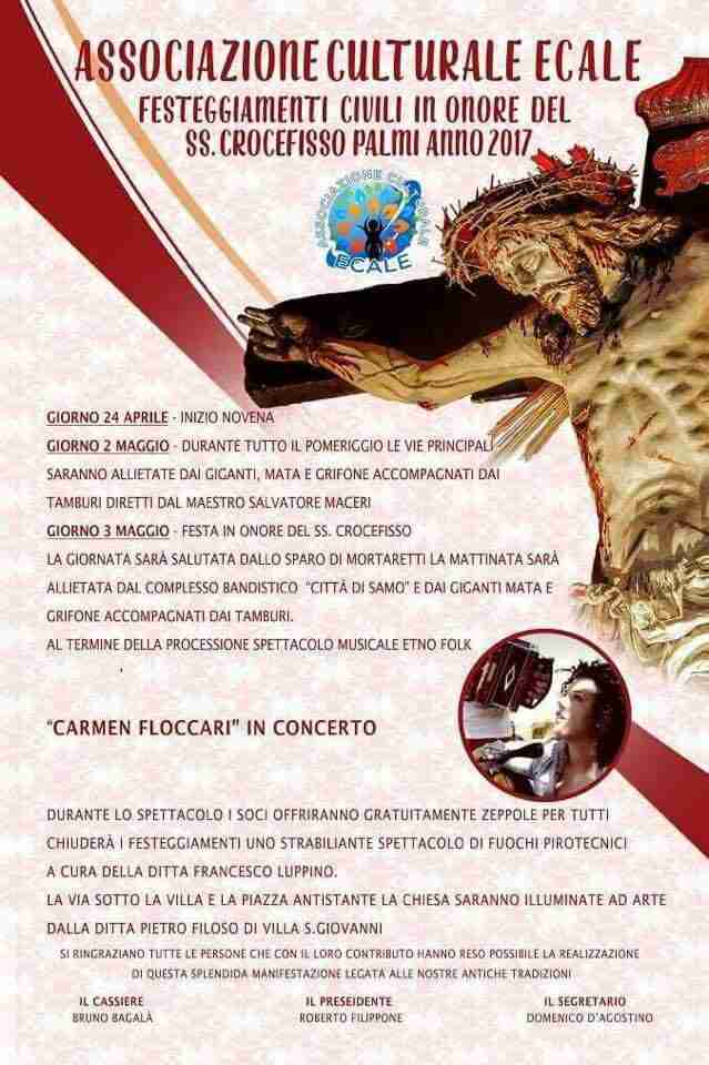 E’ stato reso noto nei giorni scorsi il calendario degli eventi civili promossi dall’associazione culturale “Ecale”, in occasione della festa del Santissimo Crocifisso che si terrà il 3 maggio prossimo.