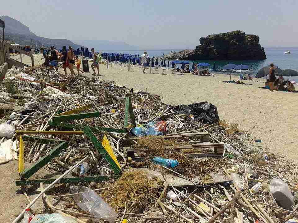 Bottiglie in plastica, sacchi neri dell’immondizia, legna, reti e molto altro ancora, giacciono a poca distanza dagli ombrelloni, sotto gli occhi dei bagnanti.