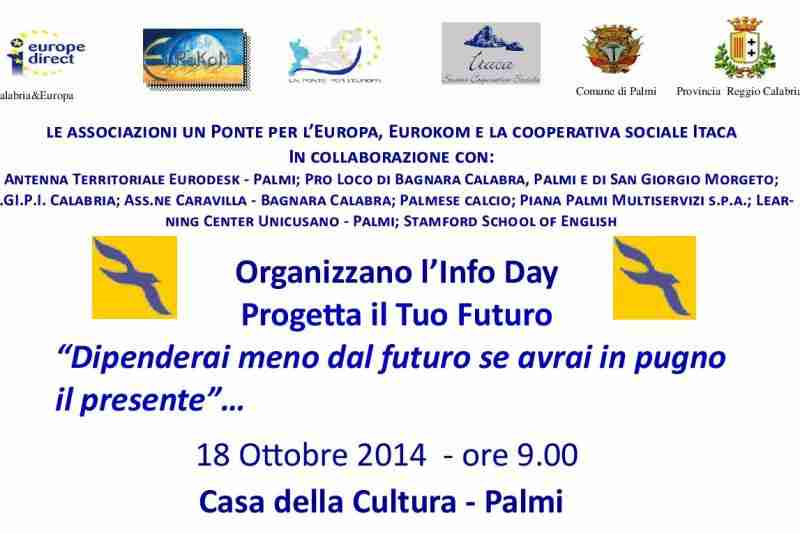 Si terrà a Palmi il prossimo 18 ottobre 2014 dalle ore 9.00 presso i locali della Casa della Cultura l’info day “Progetta il tuo futuro”. Un evento rivolto ai giovani delle ultime classi delle scuole superiori per orientarli alla scelta dei percorsi di studio e lavoro futuri in un ambito Europeo, mercato in cui è sempre fondamentale la conoscenza delle lingue straniere. L’incontro è organizzato dall’Europe Direct Calabria&Europa di Gioiosa Jonica, dall’Associazione un Ponte per l’Europa e dalla Cooperativa Sociale Itaca.