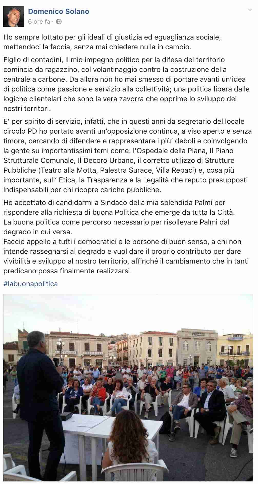 “Ho accettato di candidarmi a sindaco della mia splendida Palmi – scrive Solano – per rispondere alla richiesta di buona politica che emerge da tutta la città, la buona politica come percorso necessario per risollevare Palmi dal degrado in cui versa”.