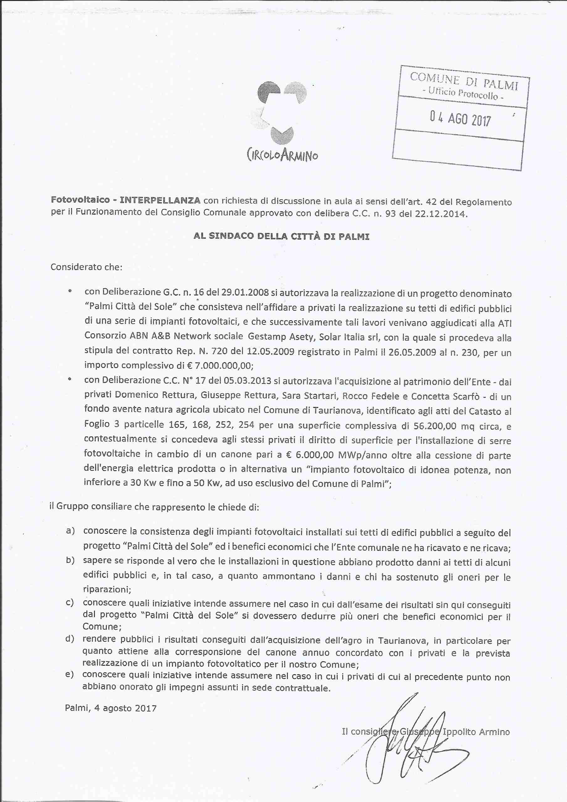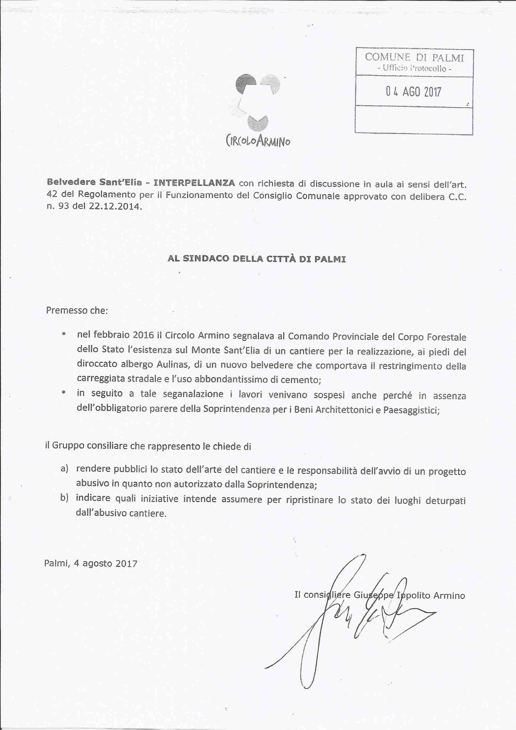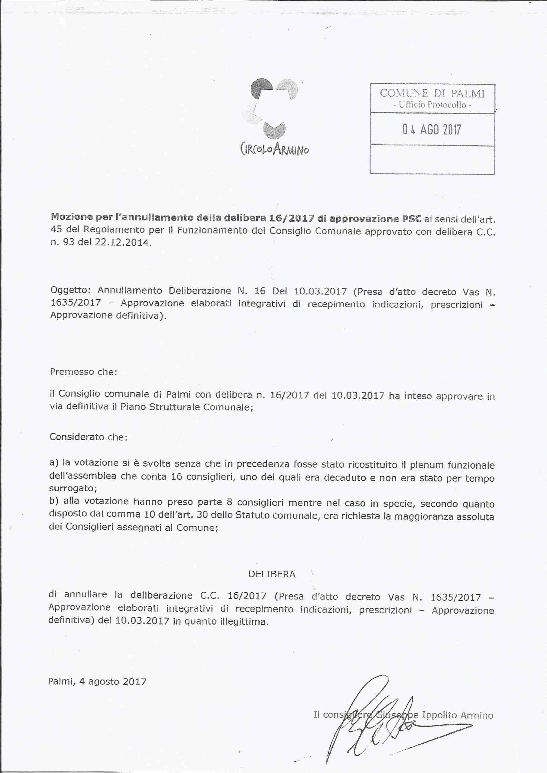 Si tratta di un’interpellanza per l’annullamento della delibera numero 16 con cui il Consiglio comunale, lo scorso 10 marzo, ha approvato in via definitiva il PSC, delibera a lungo contestata da Ippolito e dal Circolo “Armino” perché ritenuta non valida, per via di un “difetto”.