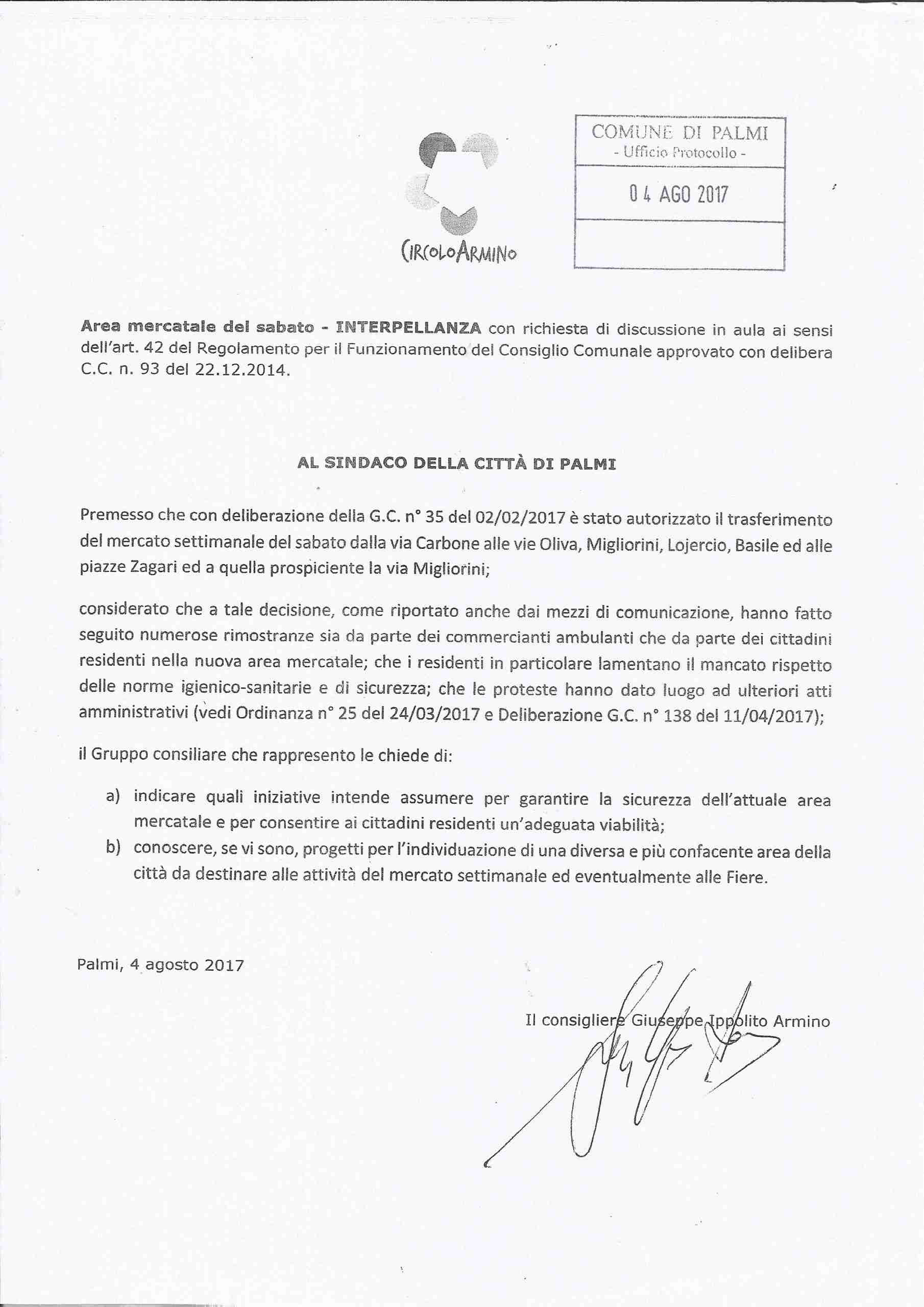 C’è infine una mozione, presentata per chiedere se l’amministrazione intende apportare modifiche alla delibera con cui è stato spostato il mercato del sabato da via Carbone alle vie Migliorini, Lojercio, Oliva, Basile e piazzale Zagari, anche a seguito delle proteste dei residenti e degli ambulanti stessi.