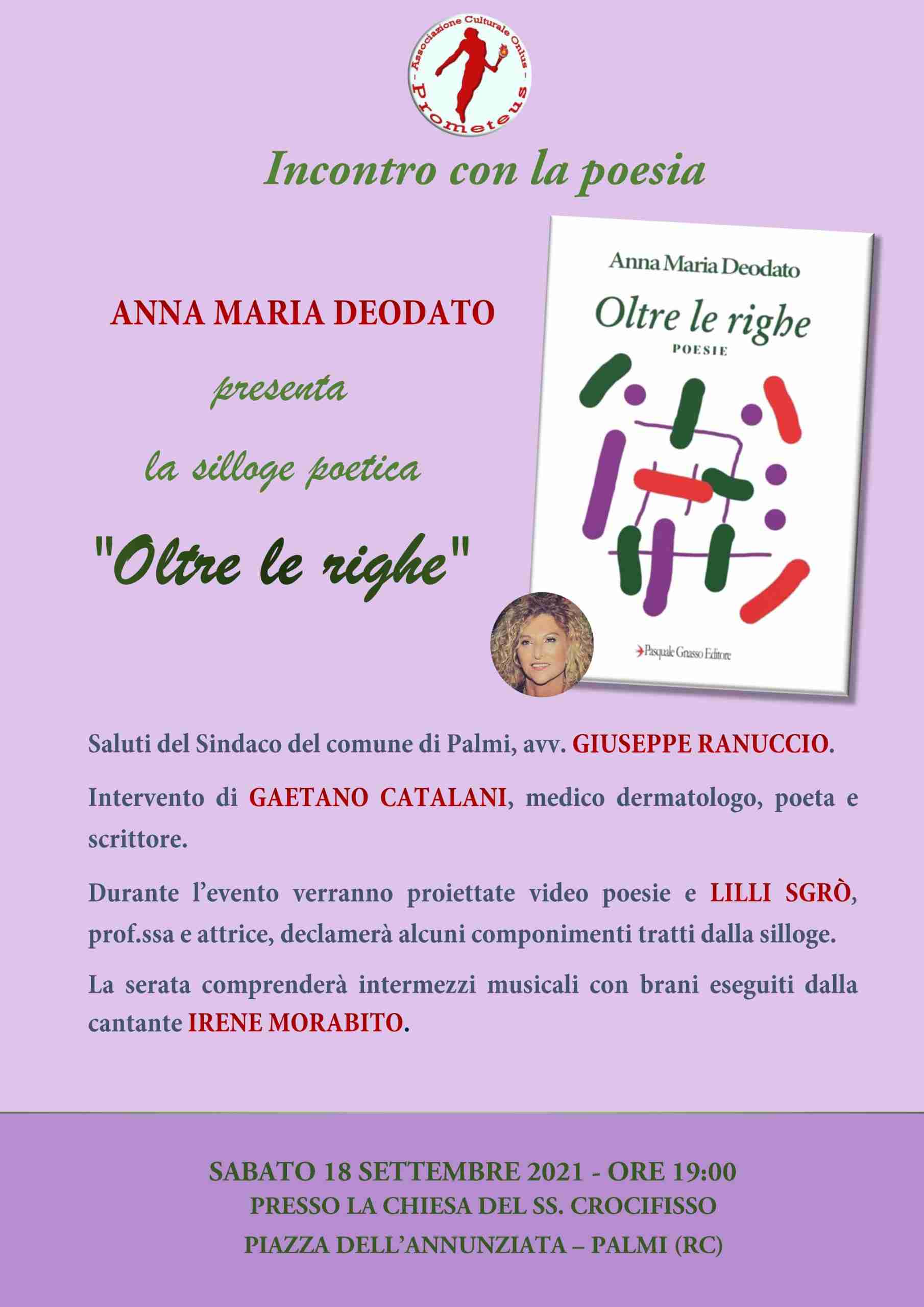 Sabato 18 settembre, nell’ambito degli appuntamenti culturali promossi l’Associazione Prometeus, presieduta da Saverio Petitto, sarà presentata la silloge “Oltre le righe” di Anna Maria Deodato. L’evento si terrà, alle ore 19.00, nell’antica chiesa del Santissimo Crocifisso di Palmi.
