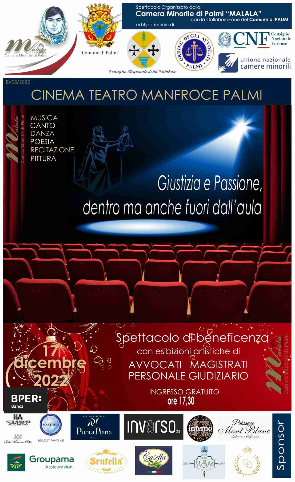 Si è svolto sabato 17 dicembre nella cornice del Cinema teatro Manfroce di Palmi “Giustizia e Passione, dentro ma anche fuori dall’aula”, l’evento organizzato dalla Camera Minorile di Palmi “Malala”, con la collaborazione del Comune di Palmi ed il Patrocinio del Consiglio Nazionale Forense, del Consiglio dell’Ordine degli Avvocati di Palmi, dell’Unione Nazionale Camere Minorili e del Consiglio Regionale e con la direzione artistica di Carmelita Avaro, Presidente della Camera Minorile e ideatrice dell’iniziativa.