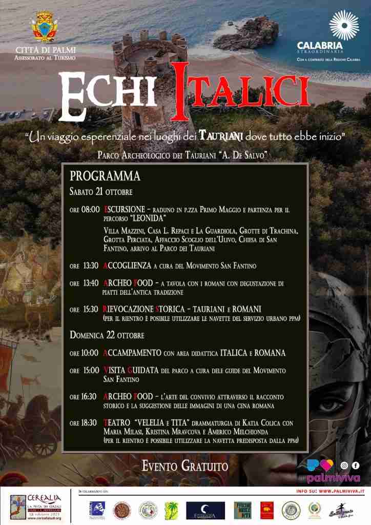 Storia, natura, cultura, enogastronomia, teatro, identità, insieme a Palmi per “Echi Italici”. La manifestazione, prevista per domani 21 e domenica 22 ottobre è un concentrato di iniziative: dall’escursione sul percorso Leonida alle degustazioni enogastronomiche, dalla rievocazione storica alla piece drammaturgica.