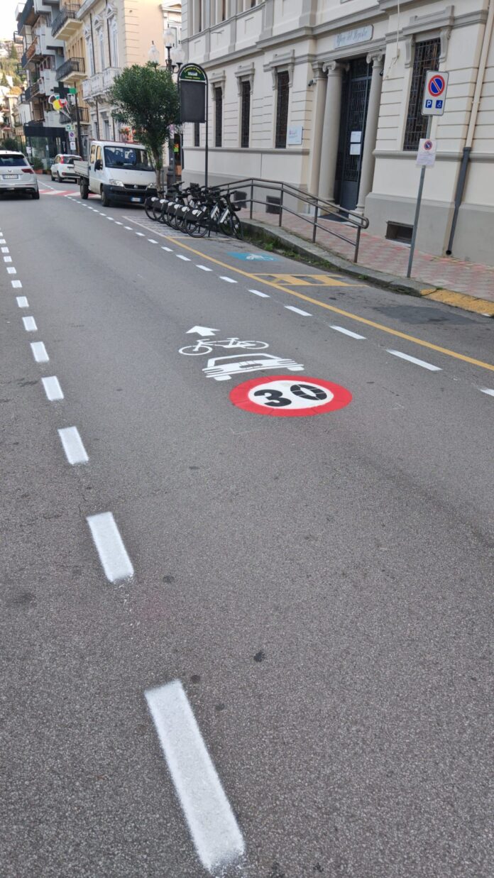 Sta suscitando curiosità e qualche dubbio la nuova segnaletica orizzontale realizzata in questi giorni su via Roma a Palmi, nel tratto urbano compreso tra il centro e le aree residenziali. Al centro della carreggiata è stato tracciato un simbolo di bicicletta sovrapposto a quello di un’automobile, accompagnato da una freccia direzionale e da un limite di velocità di 30 km/h ben visibile all’interno di un cerchio rosso.