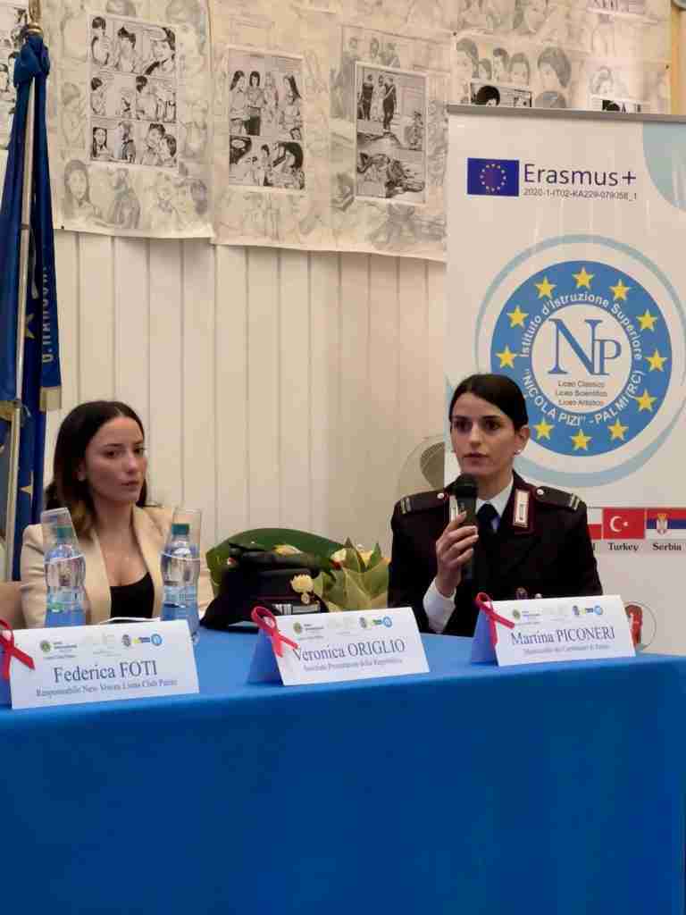 A seguire, il maresciallo dei carabinieri Martina Piconeri, in servizio presso la Stazione di Palmi, che dopo aver illustrato agli studenti un caso di maltrattamenti in famiglia del quale si è occupata, ha invitato i giovani a confidarsi con gli adulti e, soprattutto, ad avere fiducia nell’Arma.