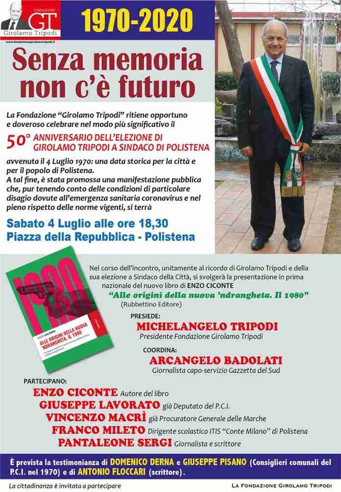 Nel corso dell’iniziativa, unitamente al ricordo di Girolamo Tripodi e della sua elezione a Sindaco della città di Polistena, si terrà la presentazione in prima nazionale del nuovo libro di Enzo Ciconte “ALLE ORIGINI DELLA NUOVA ‘NDRANGHETA. IL 1980 – LE REAZIONI DEL PCI E LE CONNIVENZE DELLA POLITICA E DELLA MAGISTRATURA” (Rubbettino editore).