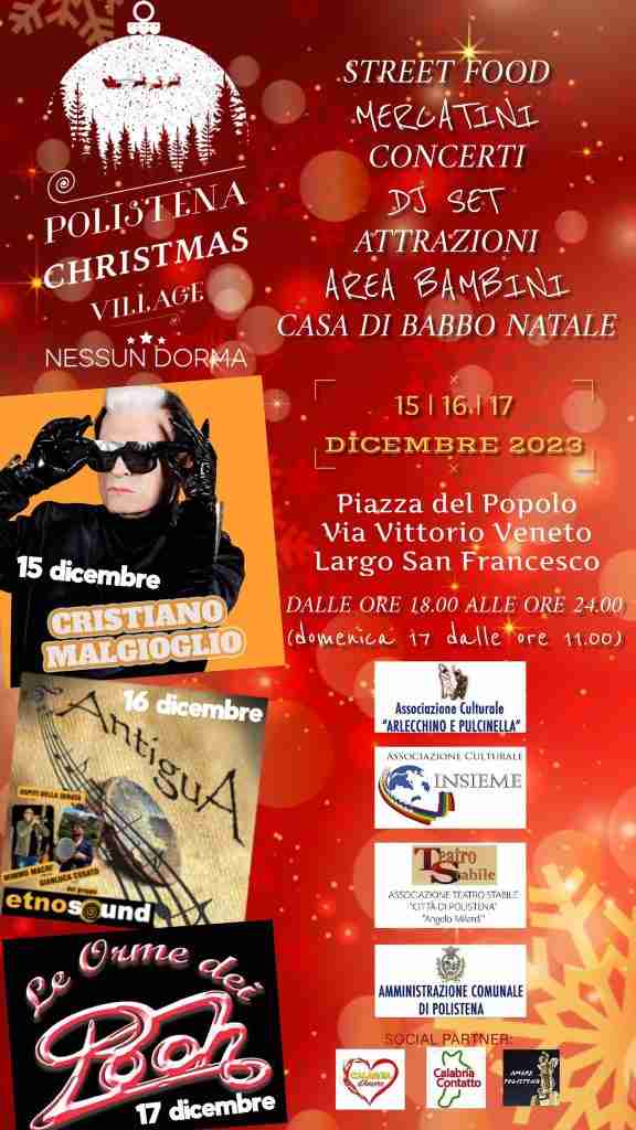 Torna il “Polistena Christmas Village – Nessun Dorma”, che quest’anno si terrà dal 15 al 17 dicembre 2023 nel cuore del centro storico: dalle ore 18.00 alle ore 24.00 nei giorni 15 e 16 dicembre, mentre dalle ore 11.00 alle ore 24 il 17 dicembre.
