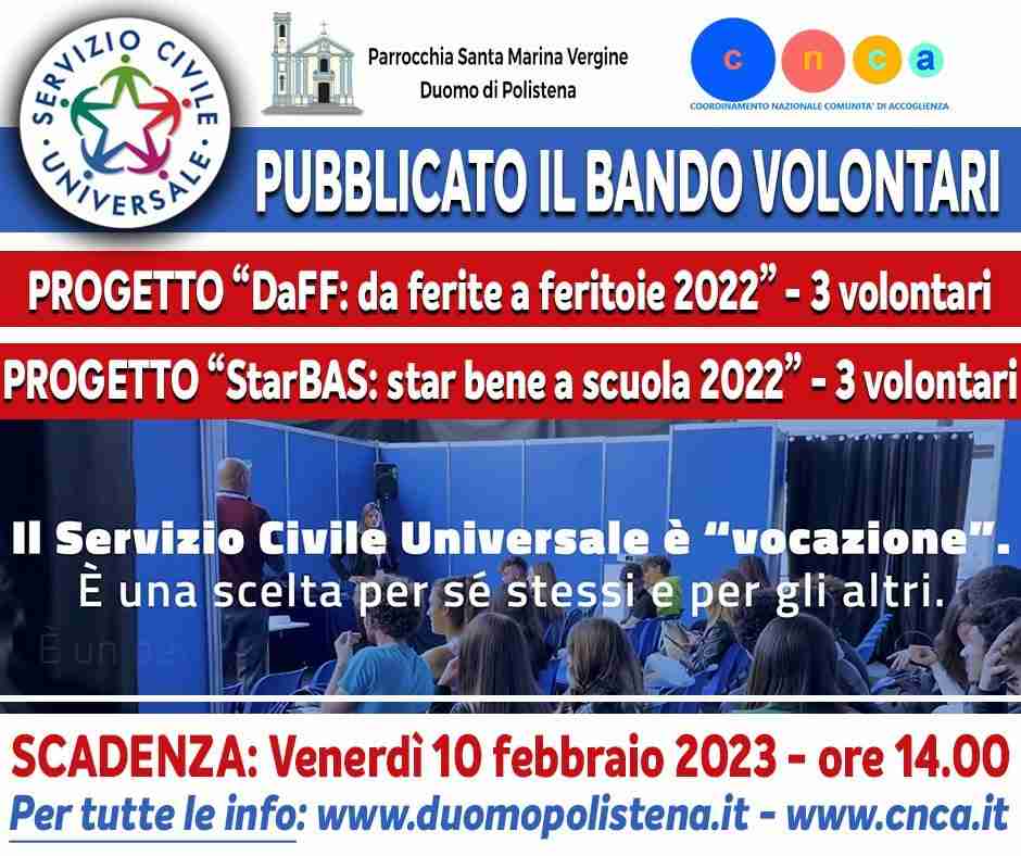 Due nuovi progetti di Servizio Civile Universale sono stati approvati alla Parrocchia Santa Marina Vergine e vedranno impegnati 6 ragazzi e ragazze del territorio, di cui due con minori opportunità. Denominati “DaFF: da ferite a feritorie. Strategie di coping e resilienza – 2022” e “StarBAS: star bene a scuola – 2022” i due interventi – che hanno l’obiettivo di contrastare e prevenire il fenomeno della povertà educativa, con particolare attenzione per l’ambito dell’educazione ed istruzione – si svolgeranno presso la sede della stessa Parrocchia e la sede del Centro di Aggregazione Giovanile “Luigi Marafioti”, situato all’interno del Centro Polifunzionale Padre Pino Puglisi in via Catena, attraverso azioni coordinate e sinergiche tali da coinvolgere i minori in maniera globale promuovendo la resilienza non solo del singolo bambino o adolescente, ma anche della famiglia di appartenenza e dell’intera comunità educante. «I racconti dei giovani ai quali, dai primi anni ottanta ad oggi, abbiamo dato l’opportunità, prima di svolgere il servizio civile alternativo a quello militare e, poi, il servizio civile universale – ha affermato il parroco, don Pino Demasi – sono un riconoscimento del valore positivo ed anche formativo di questa esperienza di servizio agli altri. Nello stesso tempo ci sentiamo incoraggiati a continuare su questo cammino che vede la Parrocchia scommettere sempre più sul campo socio-educativo». Per presentare domanda di partecipazione c’è tempo fino al 10 febbraio 2023 alle ore 14 esclusivamente attraverso la piattaforma Domanda on Line (DOL) all’indirizzo https://domandaonline.serviziocivile.it .