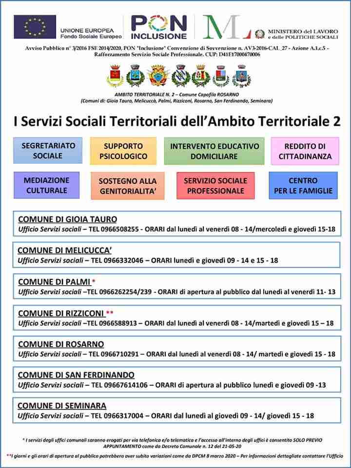 L’Ambito Territoriale n.2, comprendente i comuni di Gioia Tauro, Melicuccà, Palmi, Rizziconi, Rosarno, San Ferdinando, Seminara, con comune di Rosarno Capofila, offre ai cittadini residenti nel territorio ed in condizione di difficoltà, la possibilità di usufruire di una serie di Servizi ad accesso libero e gratuito, garantendo privacy e riservatezza.