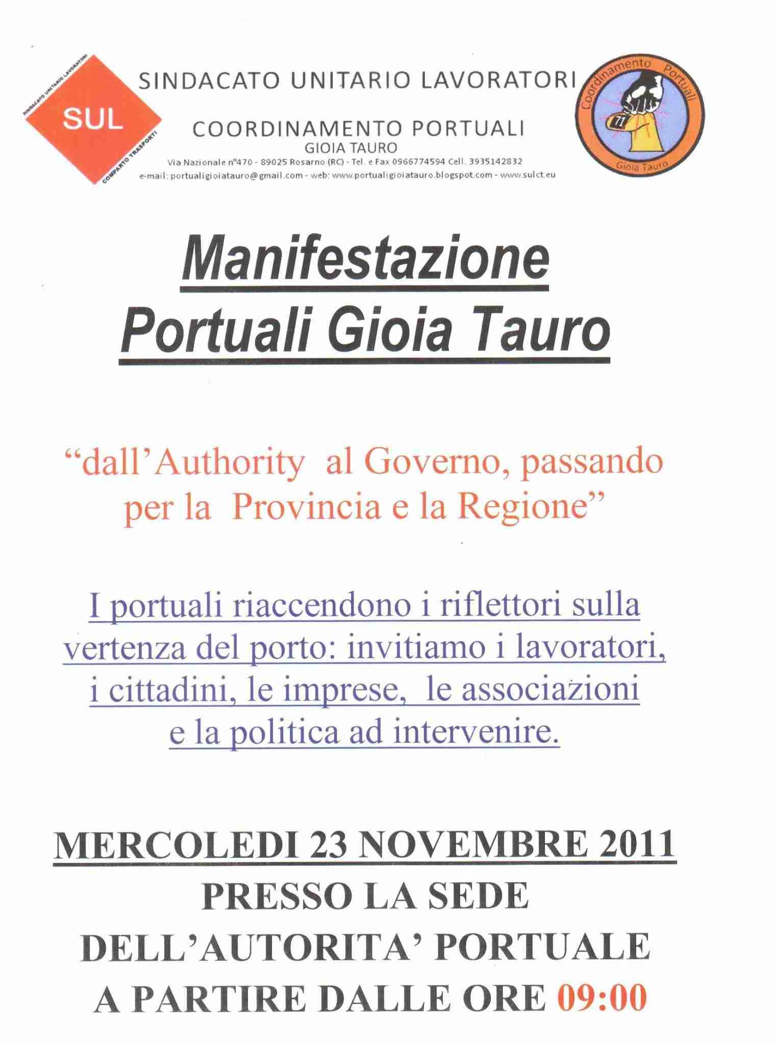 Tenuto conto della gravissima crisi che sta investendo tutto il sistema porto, il Coordinamento Portuali di Gioia Tauro, invita tutti i cittadini, i lavoratori, il Presidente della Regione Calabria, il Presidente della Provincia di Reggio Calabria, i Sindaci della Piana, gli Imprenditori, i Commercianti, le associazioni, le forze politiche, le forze sociali a partecipare alla manifestazione di mercoledì 23 novembre p.v., programmata a partire dalle ore 09.00 presso la sede dell’Autorità Portuale di Gioia Tauro, in occasione della riunione del Comitato Portuale,.