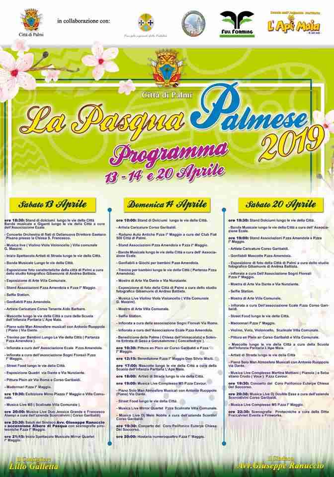 «Quella del 2019 sarà la prima edizione dei festeggiamenti pasquali palmesi, una assoluta novità per la nostra città, e che siamo convinti possa costituire una importante spinta anche per il tessuto economico», ha detto il sindaco Giuseppe Ranuccio.