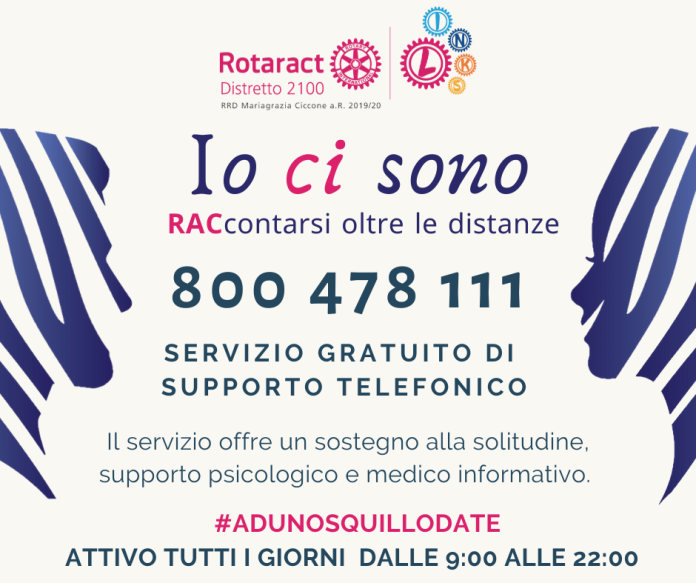 Un numero verde per aiutare, una voce amica per sentirsi meno soli, un’iniziativa per offrire un sostegno alla solitudine, supporto psicologico e medico-informativo a chi ne ha bisogno: il Rotaract Distretto 2100 avvia il progetto “Io ci sono, RACcontarsi oltre le distanze”.