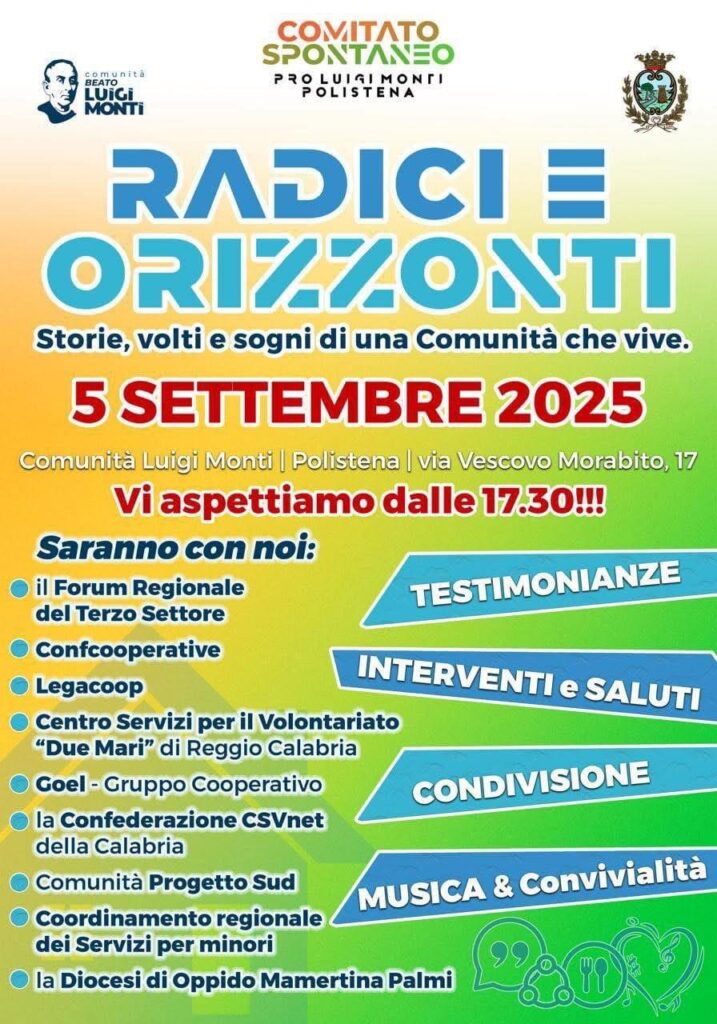 Polistena – Venerdì 5 settembre 2025, dalle ore 17.30, presso la Comunità Luigi Monti di Polistena (via Vescovo Morabito, 17), si terrà la manifestazione pubblica “Radici e Orizzonti – Storie, volti e sogni di una Comunità che vive”, promossa dal “Comitato Spontaneo Pro Luigi Monti” con il sostegno di cittadini, associazioni, enti e istituzioni.