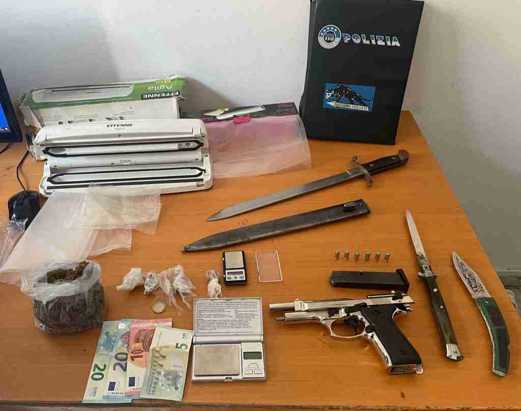 L’uomo è stato arrestato per detenzione ai fini di spaccio di sostanza stupefacente e deferito per i reati di violazione degli obblighi inerenti alla sorveglianza speciale, porto senza giustificato motivo di armi prive di tappo rosso e detenzione abusiva di armi bianche.
