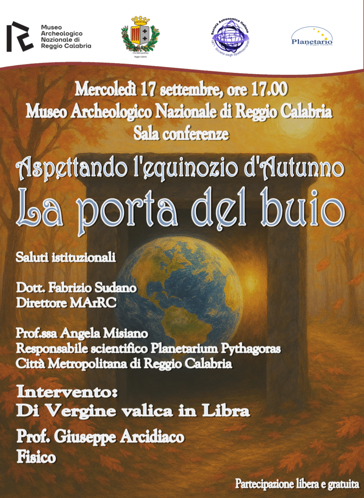 Oggi alle ore 17.00, presso il Museo Archeologico Nazionale di Reggio Calabria, si terrà l’incontro dal titolo “Aspettando l’Equinozio d’Autunno: di Vergine valica in Libra”, un affascinante viaggio tra cielo e pensiero condotto dal Prof. Giuseppe Arcidiaco, fisico e collaboratore del Planetario.