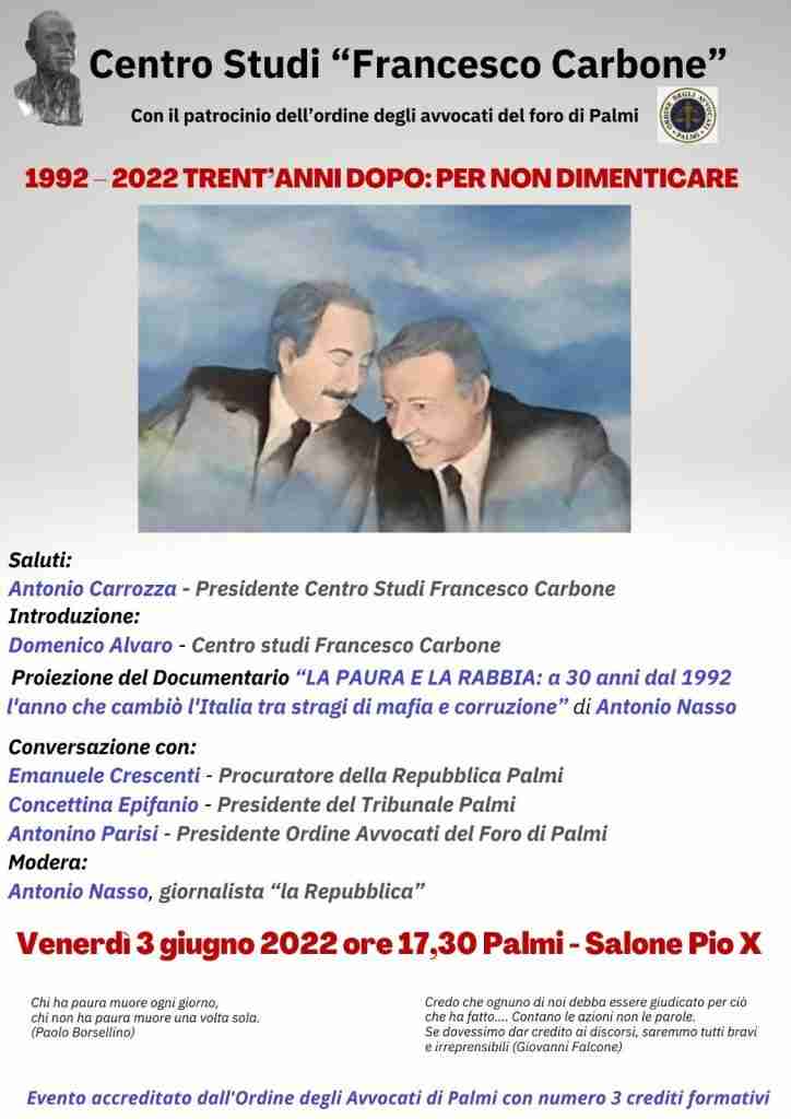 Il Salone Pio X di Palmi ospiterà l’evento promosso dal Centro studi “Francesco Carbone”, dal titolo “1992-2022 trent’anni dopo per non dimenticare”, in programma venerdì 3 giugno alle 17:30.