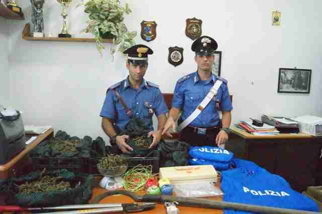 In quell’area erano nascosti altri due sacchetti di plastica con dentro 8 chili e mezzo di cannabis non ancora perfettamente essiccata, e sopra un albero di agrumi, nascosto tra le fronde, un sacchetto con all’interno 10 k-way di colore azzurro, a manica lunga, marca “Quechua”, recanti, sul fronte e sul retro, la scritta “Polizia” in bianco.