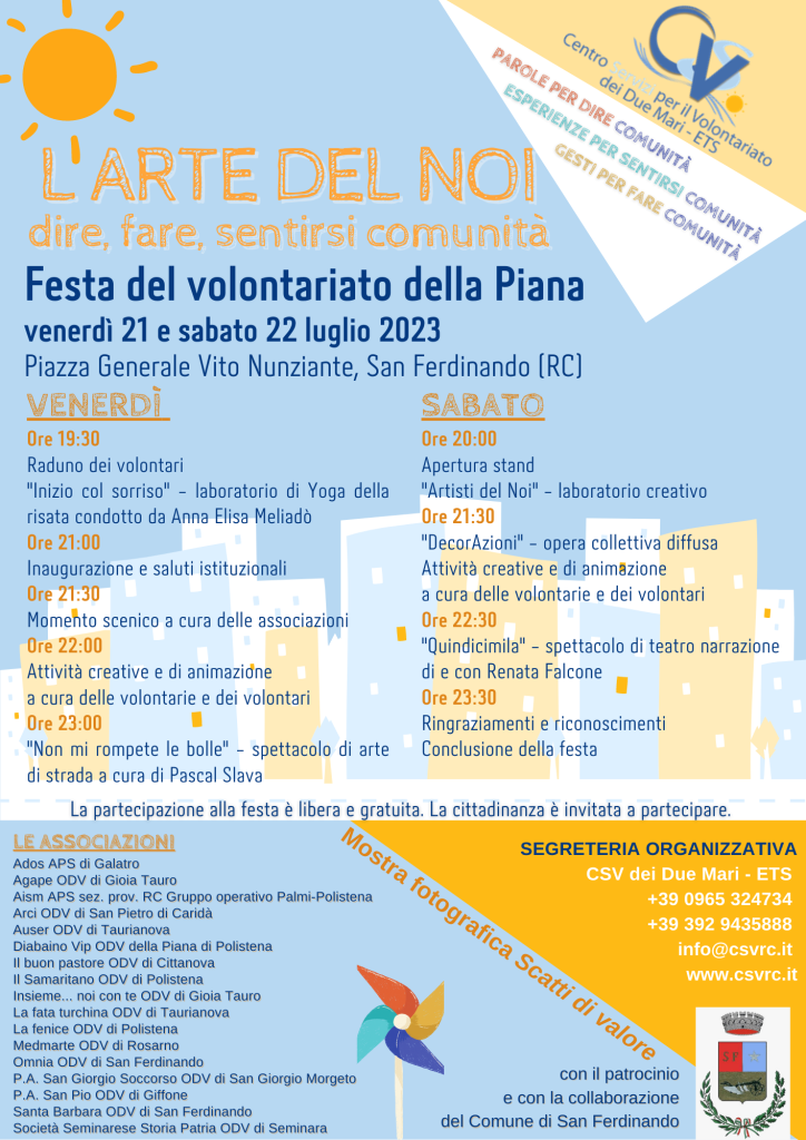 La manifestazione, che si svolgerà nelle sere di venerdì 21 e sabato 22 luglio a San Ferdinando, nel suggestivo e accogliente scenario di Piazza Generale Nunziante, è promossa e organizzata dal Centro Servizi per il Volontariato dei Due Mari – ETS di Reggio Calabria con il patrocinio e con la fattiva collaborazione dell’Amministrazione Comunale di San Ferdinando e con l’adesione delle associazioni Ados APS di Galatro, Agape ODV di Gioia Tauro, Aism sez. prov. RC Gruppo operativo Palmi-Polistena, Arci di San Pietro di Caridà, Auser ODV di Taurianova, Diabaino Vip ODV della Piana di Polistena, Il buon pastore ODV di Cittanova, Il Samaritano ODV di Polistena, Insieme noi con te ODV di Gioia Tauro, La fata turchina ODV di Taurianova, La fenice ODV di Polistena, Medmarte ODV di Rosarno, Omnia ODV di San Ferdinando, P.A. S. Giorgio Soccorso ODV di S. Giorgio Morgeto, P.A. San Pio ODV di Giffone, Santa Barbara ODV di San Ferdinando, Società Seminarese Storia Patria ODV di Seminara.