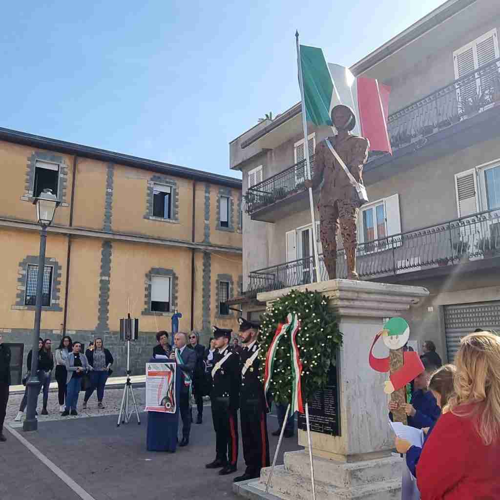 Una cerimonia istituzionale che, partita dalla Caserma dei Carabinieri con il raduno delle autorità, della cittadinanza e delle scuole, dopo l’alzabandiera ha visto una silenziosa marcia fino all’omonima piazza per la consegna di una corona d’alloro, accolti dal parroco don Domenico Cacciatore.
