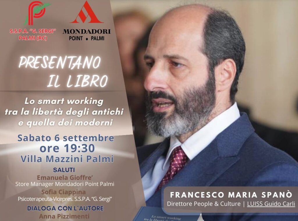 La rassegna letteraria curata da Mondadori Point Palmi e Scuola di Psicologia Applicata ” G.Sergi” di Palmi si avvia alla conclusione con un appuntamento che invita alla riflessione sul presente e sul futuro del lavoro. Sabato alle ore 19:30, nella suggestiva cornice della Villa, sarà ospite Francesco Maria Spanó, autore del libro “Lo smart working tra la libertà degli antichi e quella dei moderni”.