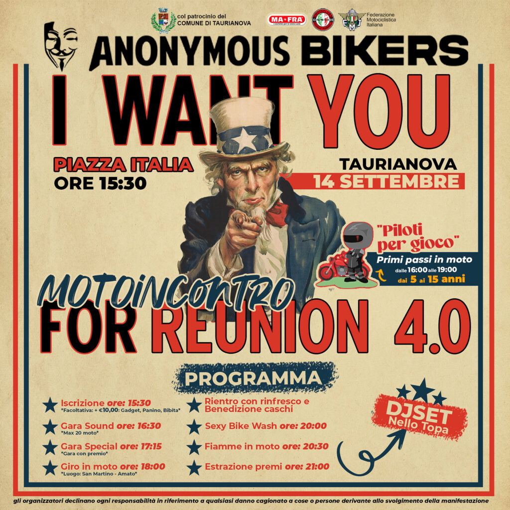 Il rombo dei motori si prepara a invadere le strade di Taurianova: sabato 14 settembre, a partire dalle ore 15:30, in Piazza Italia si terrà il tanto atteso MotoIncontro Reunion 4.0, organizzato dagli Anonymous Bikers con il patrocinio del Comune di Taurianova.
