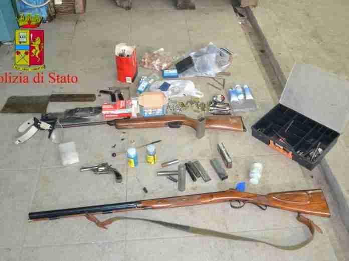 Durante la perquisizione i poliziotti hanno trovato un fucile calibro 12 monocanna ad avancarica, una pistola calibro 38 revolver, e tantissimi pezzi di armi (canne, molle di recupero, caricatori, cani e percussori).