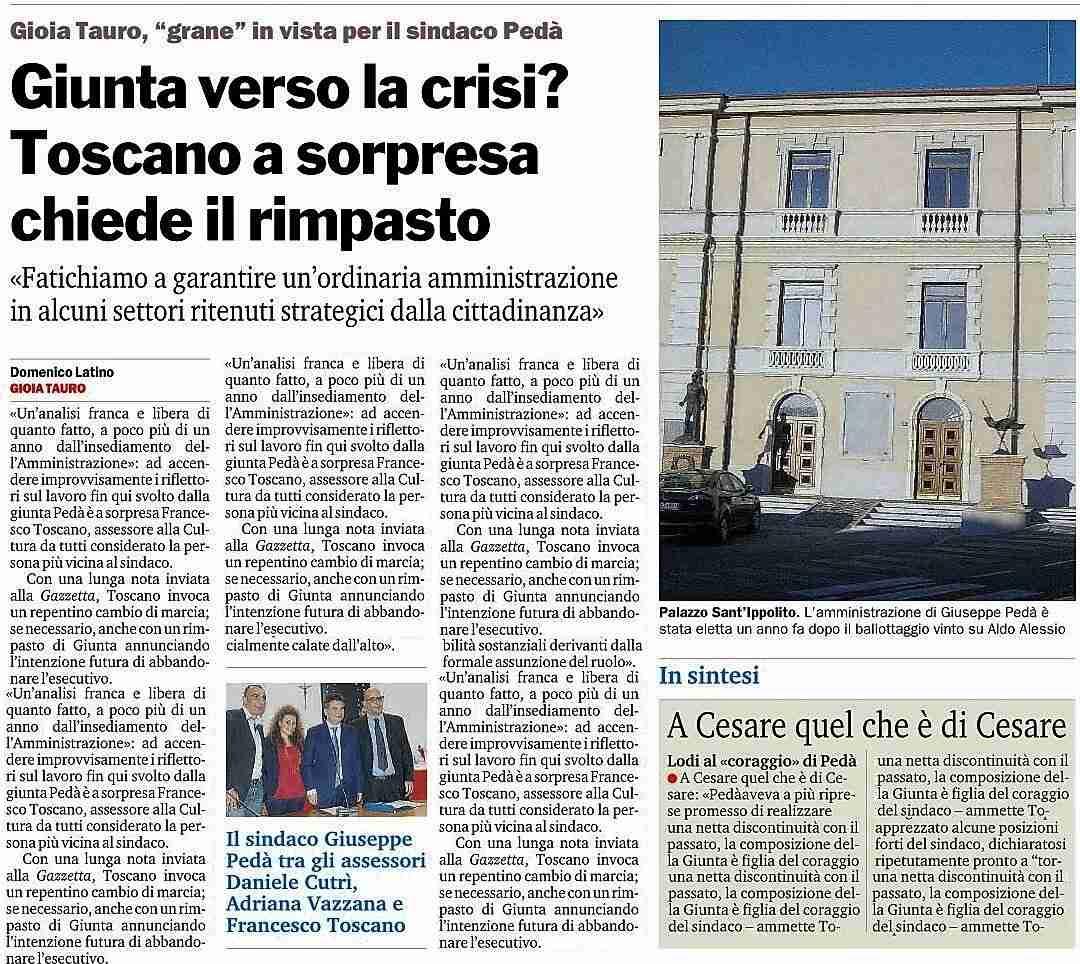Che Francesco Toscano fosse abituato ad andare fuori dagli schemi era noto da tempo a molti ma in pochi si aspettavano che l’assessore alla Cultura del comune di Gioia Tauro potesse, dalle colonne di Gazzetta del sud, chiedere un rimpasto della giunta, di cui egli stesso fa parte.