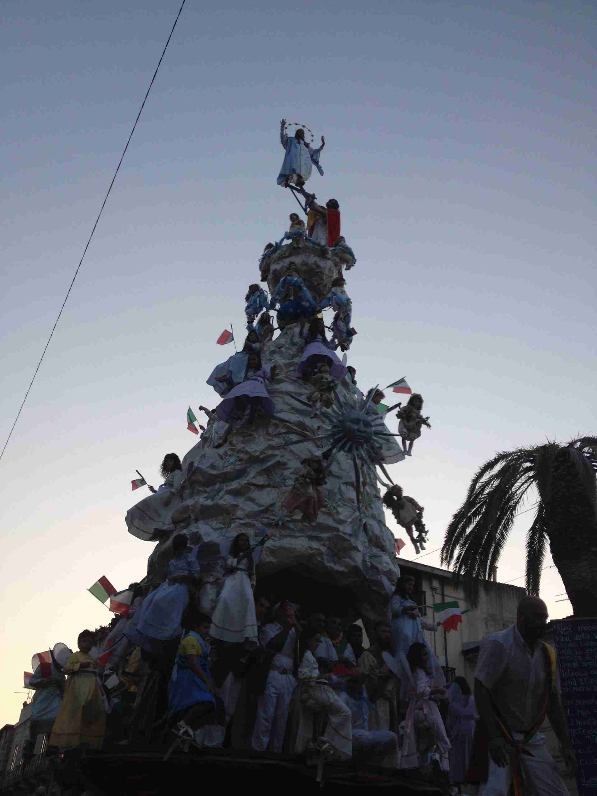 Alle 19 in punto tre colpi di cannone annunceranno che è il momento della scasata, e la Varia, l’enorme nuvola che rappresenta l’assunzione al cielo della Madonna, volerà trasportata a spalla dalla forza di 200 ragazzi – gli ‘mbuttaturi – aiutati dal popolo che tira le lunghe corde.