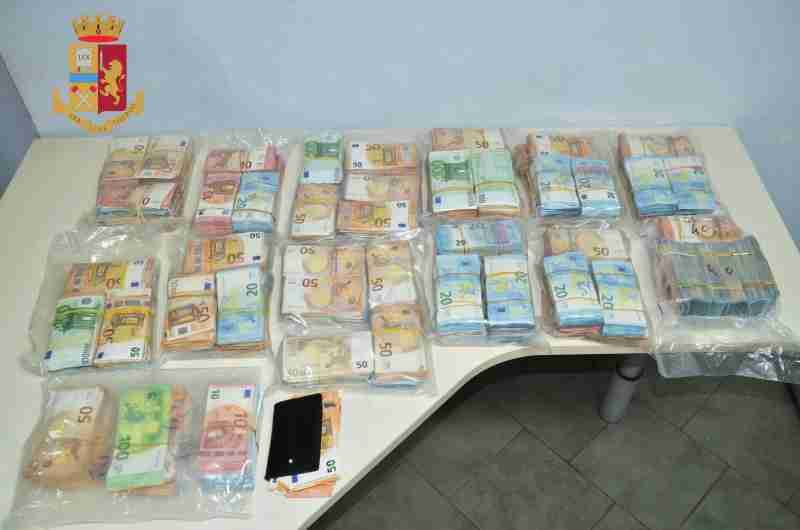 La perquisizione veicolare ha dato esito positivo, in quanto nel vano situato nella parte alta della cabina dell’autista gli agenti hanno trovato un coltello con manico in legno e lama di 18 centimetri, mentre al di sotto del materasso della lettiga, adibita a riposo degli occupanti, c’erano varie buste contenti un ingente quantitativo di denaro per un valore di euro 599.960,00, sotto forma di sacchetti sottovuoto.