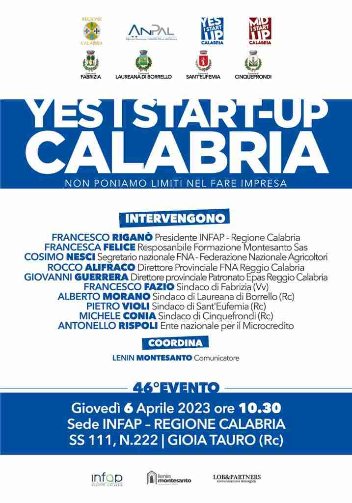 Coordinati dal comunicatore Lenin Montesanto interverranno insieme a Rispoli, Francesca Felice, responsabile Formazione Montesanto Sas, tra i soggetti attuatori del progetto Yes I Start Up Calabria, Francesco Riganò – Presidente INFAP – Regione Calabria, Cosimo Nesci Segretario nazionale FNA – Federazione Nazionale Agricoltori, Rocco Alifraco, Direttore Provinciale FNA Reggio Calabria, Giovanni Guerrera Direttore provinciale Patronato Epas Reggio Calabria ed i sindaci di Fabrizia (Vv), Laureana di Borrello (Rc), Sant’Eufemia (Rc), Cinquefrondi (Rc), Francesco Fazio, Alberto Morano, Pietro Violi. – (FONTE: Ente Nazionale Microcredito Calabria – Comunicazione Istituzionale/Strategica – Lenin Montesanto Comunicazione & Lobbying).